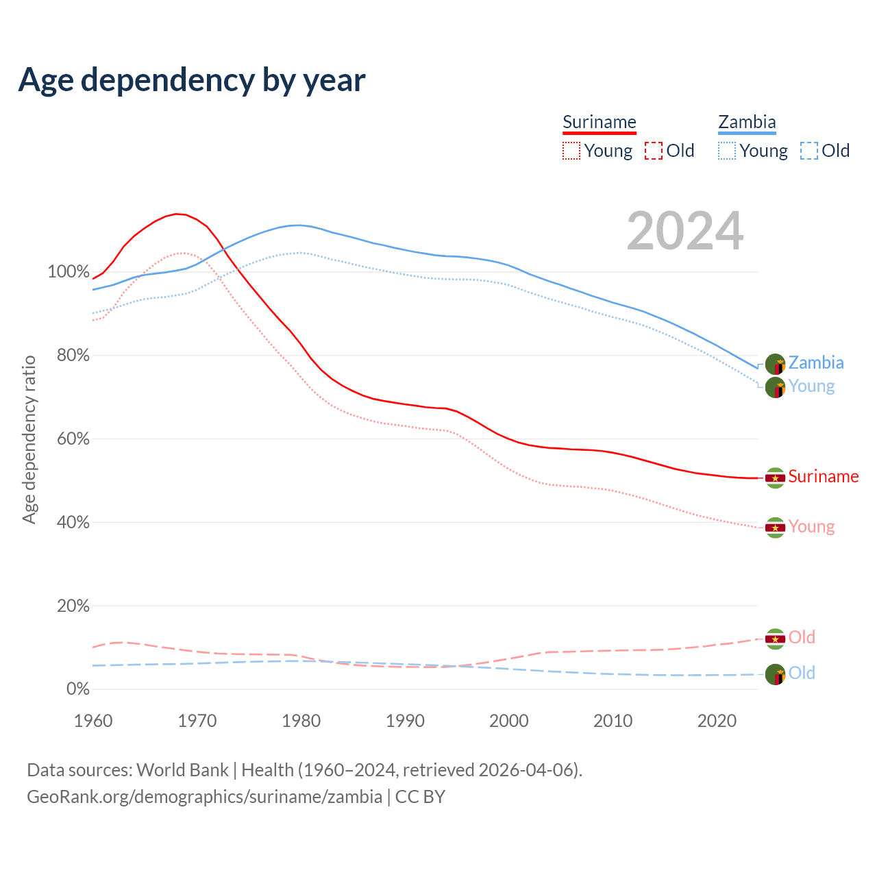 - The share of young demographic (0-15 years old) in Suriname is 25.6% vs 41.5% in Zambia.