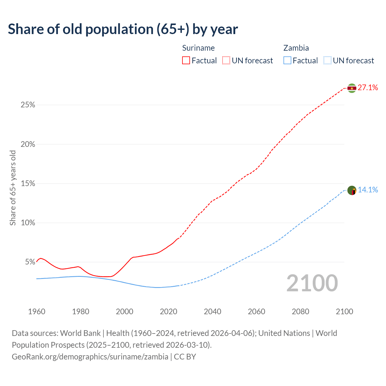 The share of older people aged 65 and over is 7.9% in Suriname and 1.95% in Zambia. Life expectancy in Suriname compared to Zambia .