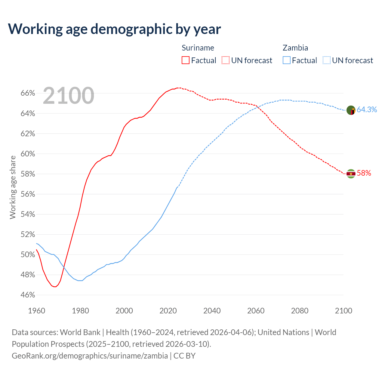 Median age Suriname vs Zambia, 1960-2100