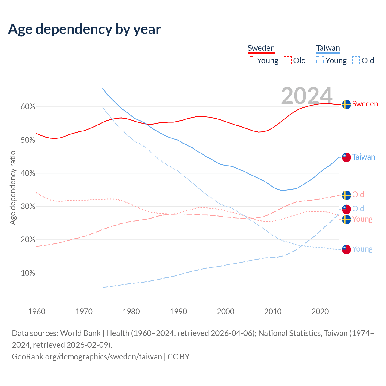 Data sources: World Bank | Health (1960–2024, retrieved 2026-04-06); U.S. Census Bureau (1960–2024, retrieved 2026-02-08); National Statistics, Taiwan (1974–2024, retrieved 2026-02-09).