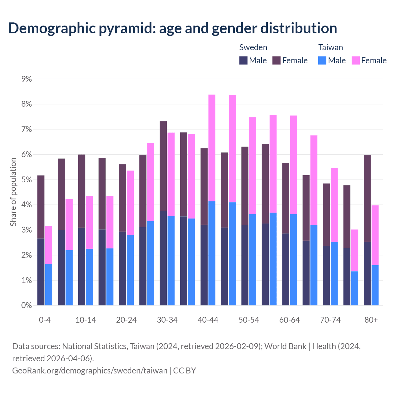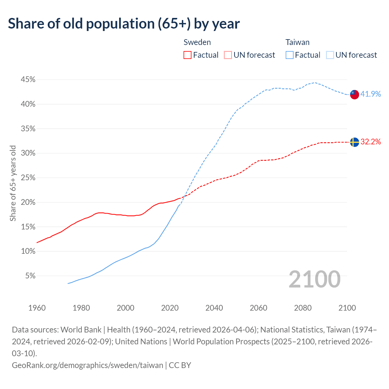 The share of older people aged 65 and over is 20.7% in Sweden and 19.2% in Taiwan. Life expectancy in Sweden compared to Taiwan .