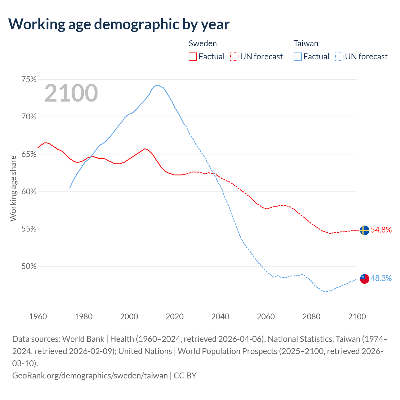 Median age Sweden vs Taiwan, 1960-2100