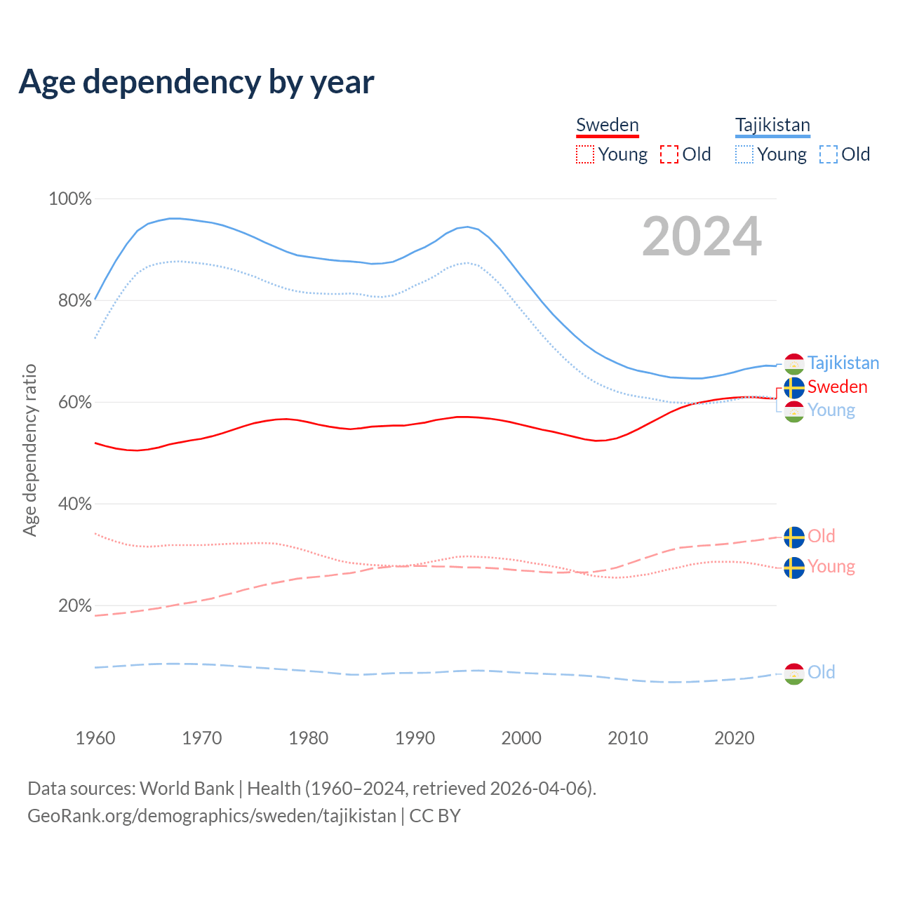 - Sweden is ranked 39/196 by median age (oldest to youngest) vs 142/196 for Tajikistan.