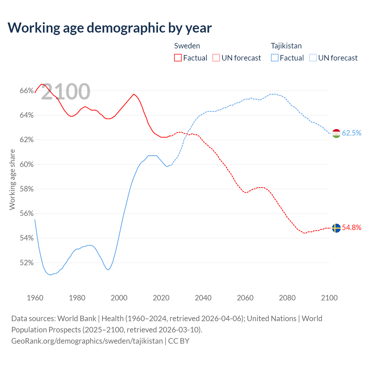 - Sweden has 6.65M working age adults (aged 15-64) vs 6.61M in Tajikistan.