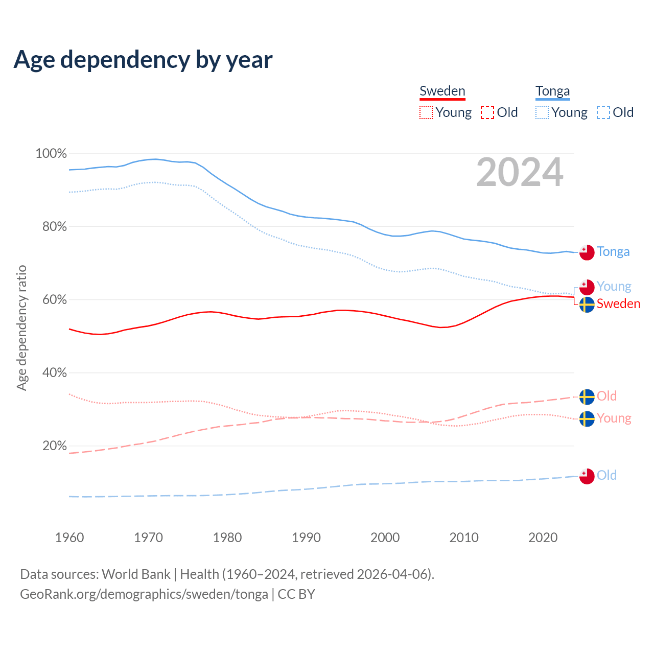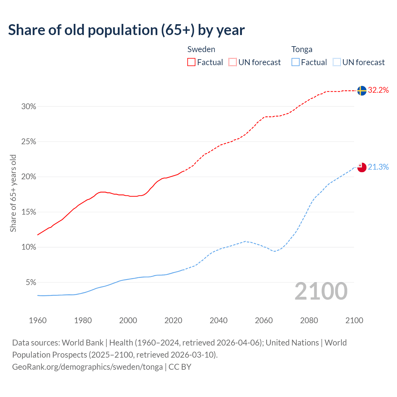 The share of older people aged 65 and over is 20.7% in Sweden and 6.72% in Tonga. Life expectancy in Sweden compared to Tonga .