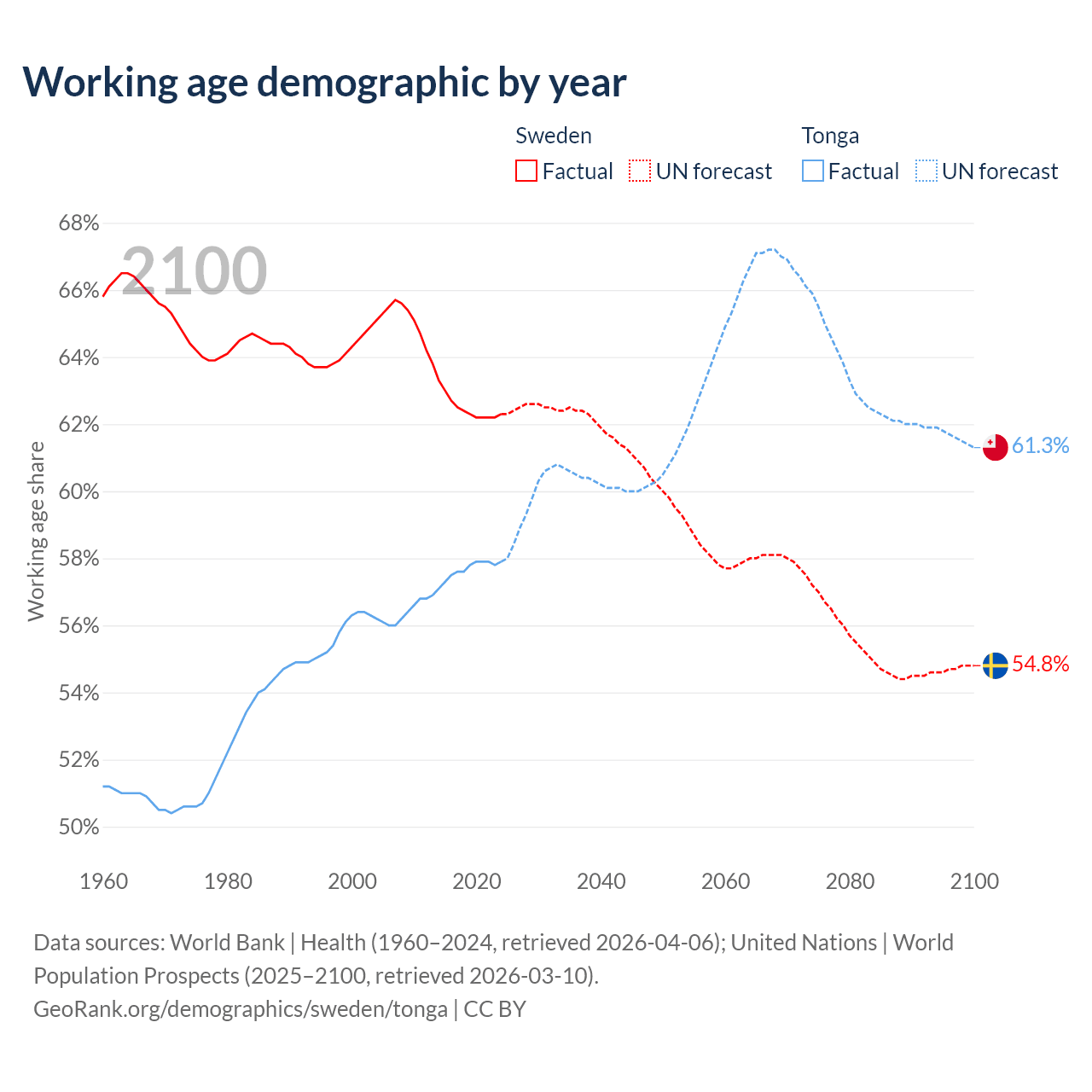 - Sweden has 6.65M working age adults (aged 15-64) vs 59.8K in Tonga.