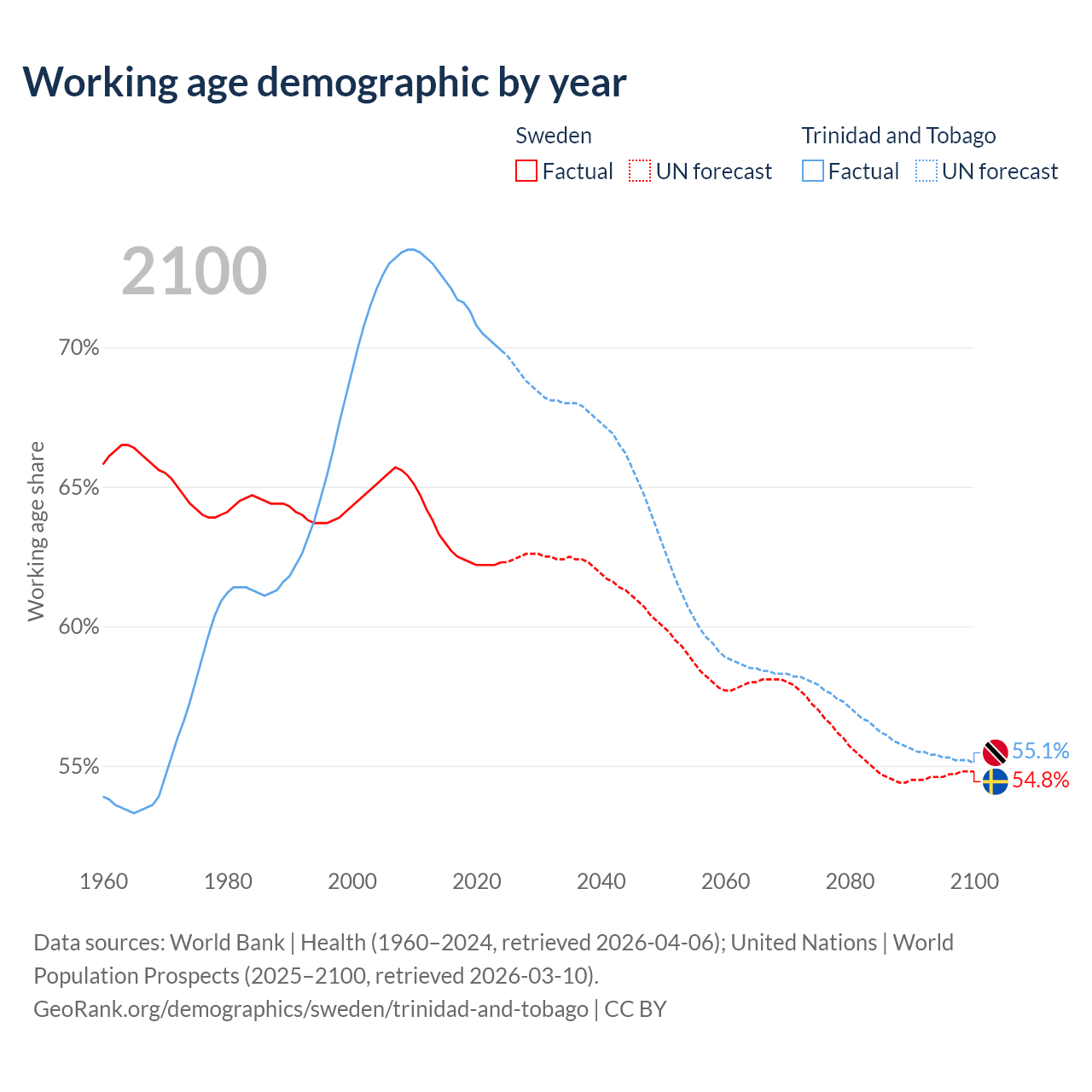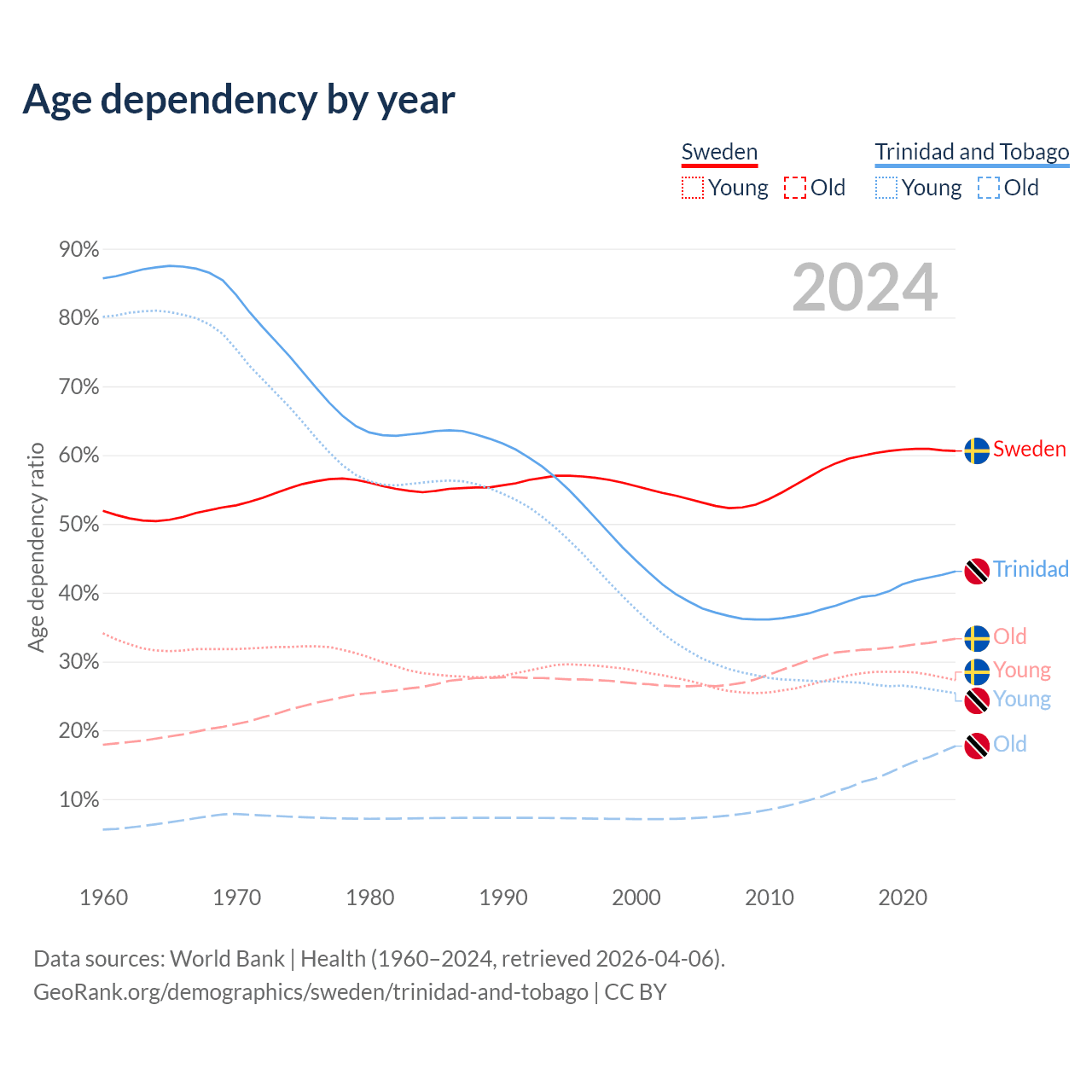 - The share of young demographic (0-15 years old) in Sweden is 17% vs 17.8% in Trinidad and Tobago.