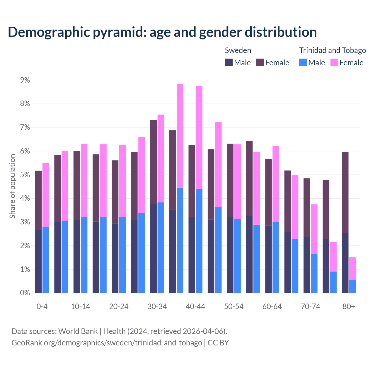 - Sweden is ranked 39/196 by median age (oldest to youngest) vs 58/196 for Trinidad and Tobago.