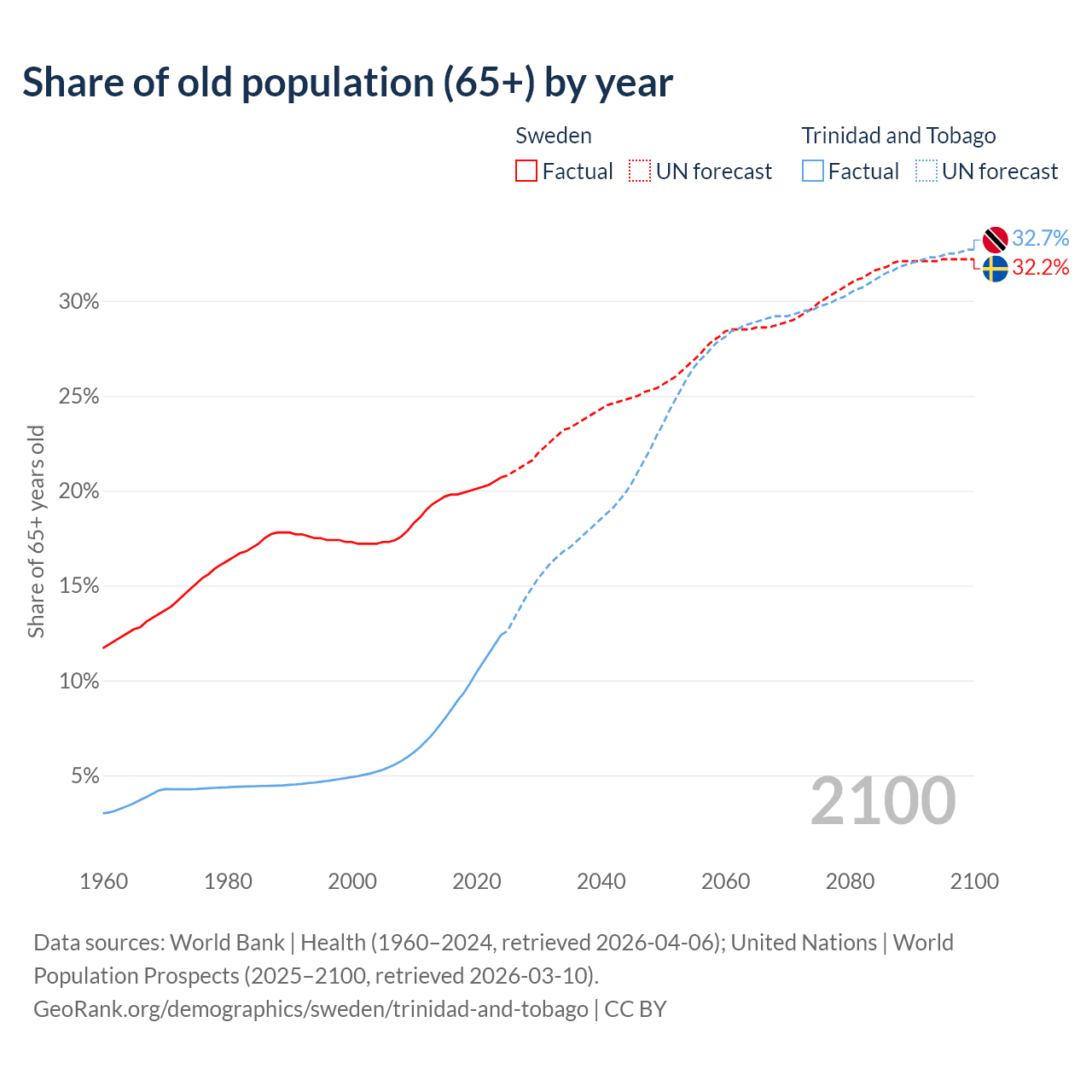 The share of older people aged 65 and over is 20.7% in Sweden and 12.4% in Trinidad and Tobago. Life expectancy in Sweden compared to Trinidad and Tobago .