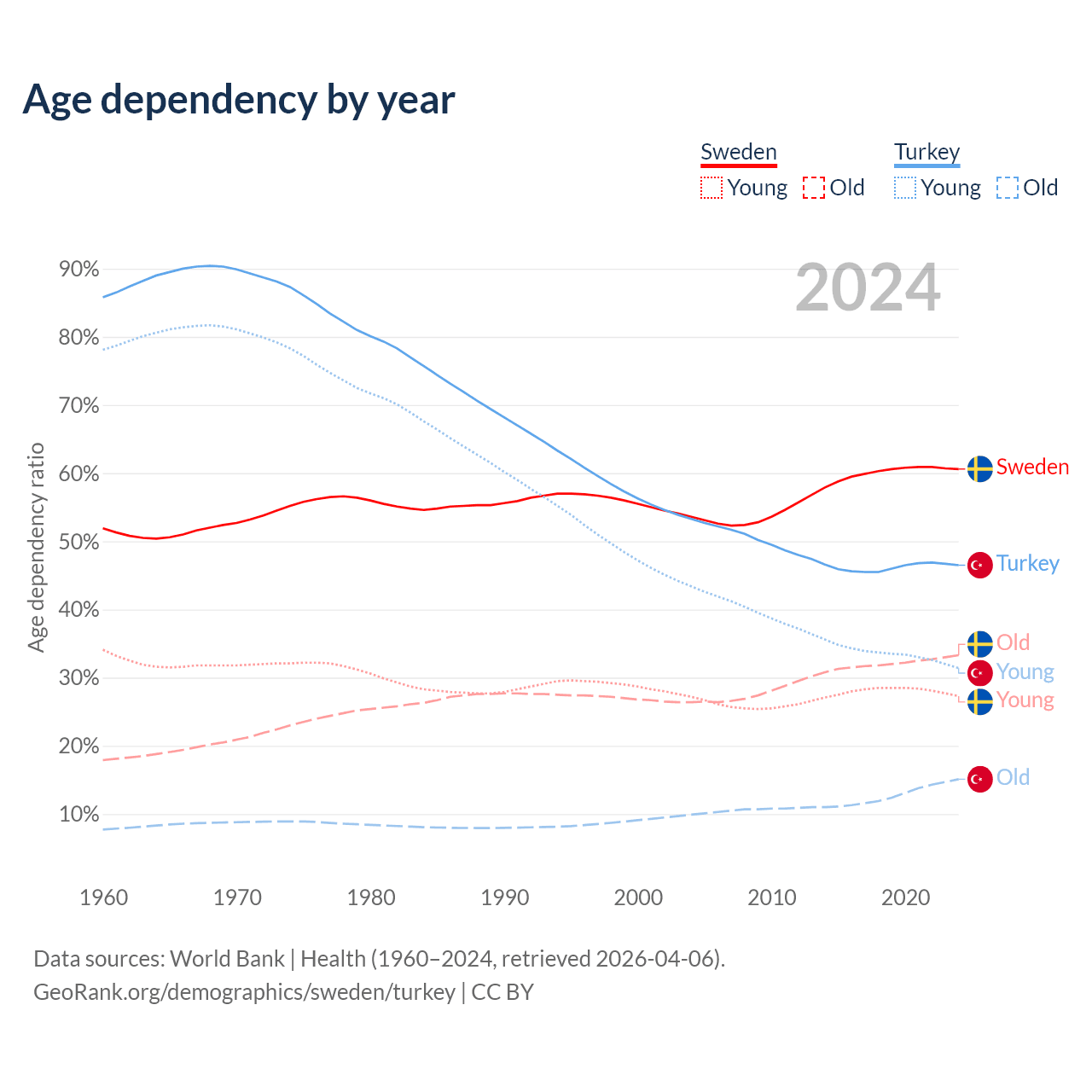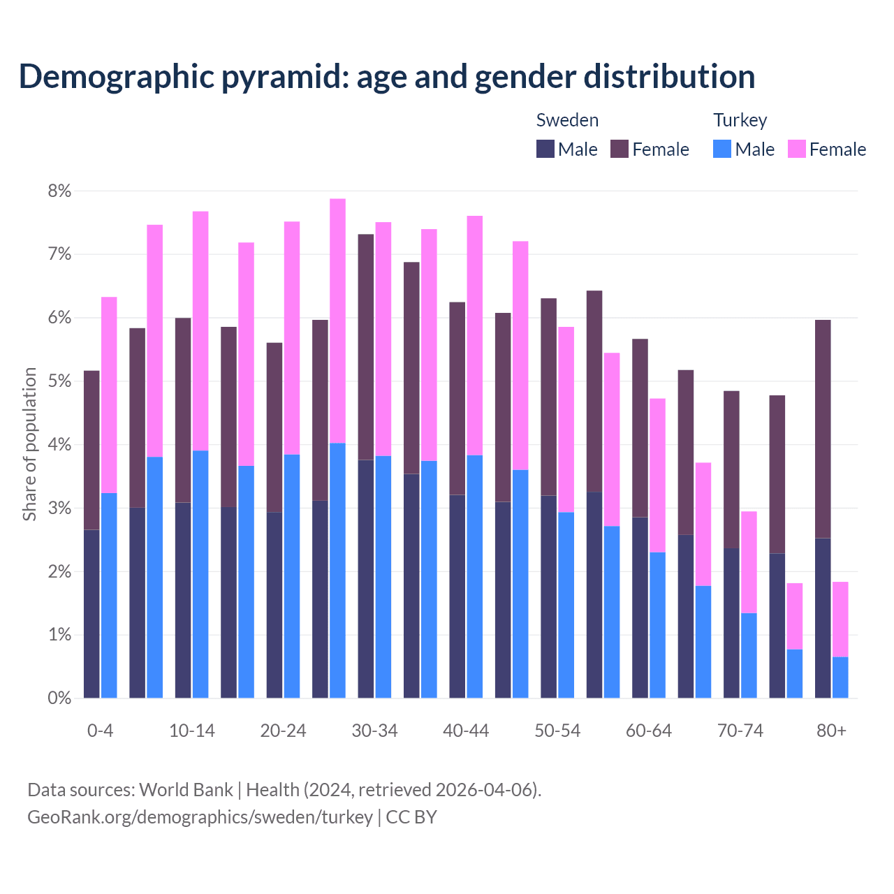 - Sweden is ranked 39/196 by median age (oldest to youngest) vs 83/196 for Turkey.