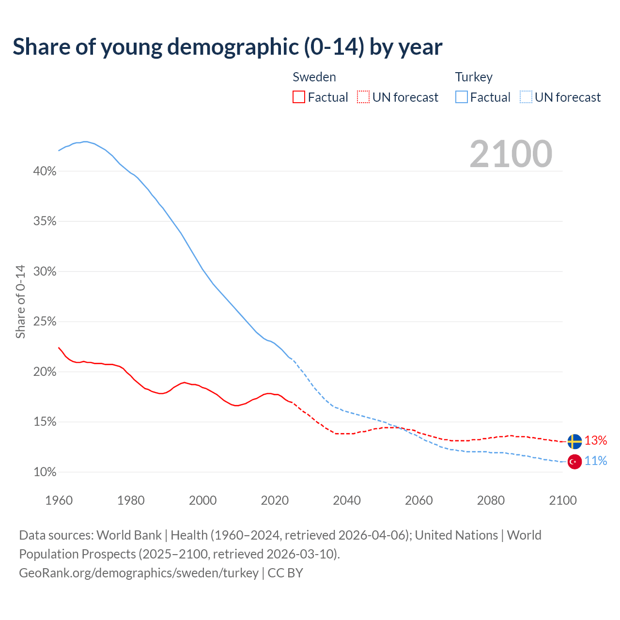 - The share of young demographic (0-15 years old) in Sweden is 17% vs 21.4% in Turkey.