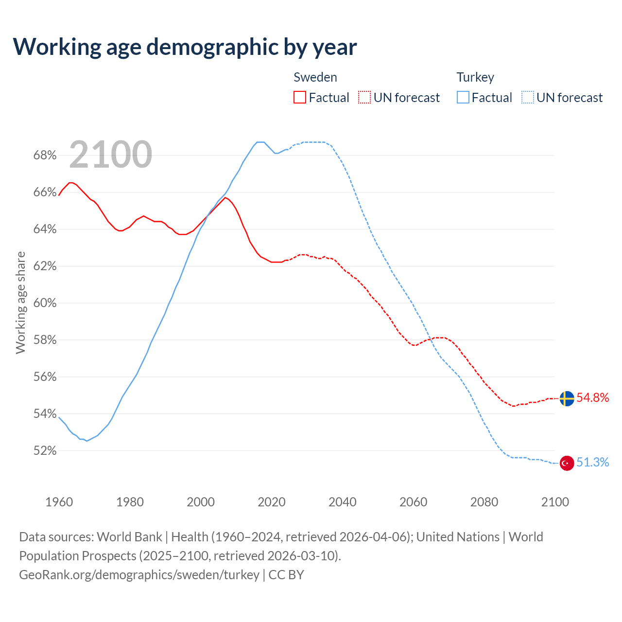 - Sweden has 6.65M working age adults (aged 15-64) vs 58.7M in Turkey.