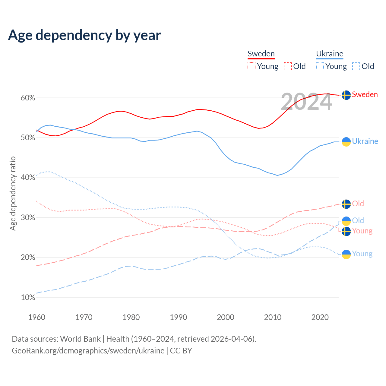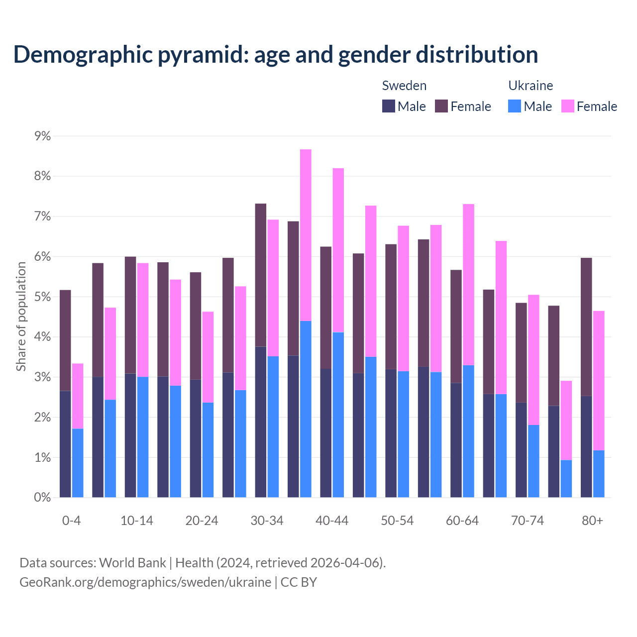 - Sweden is ranked 39/196 by median age (oldest to youngest) vs 26/196 for Ukraine.
