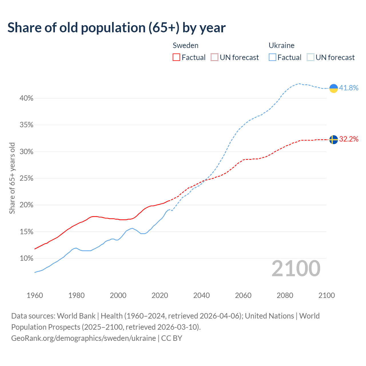 The share of older people aged 65 and over is 20.7% in Sweden and 19% in Ukraine. Life expectancy in Sweden compared to Ukraine .