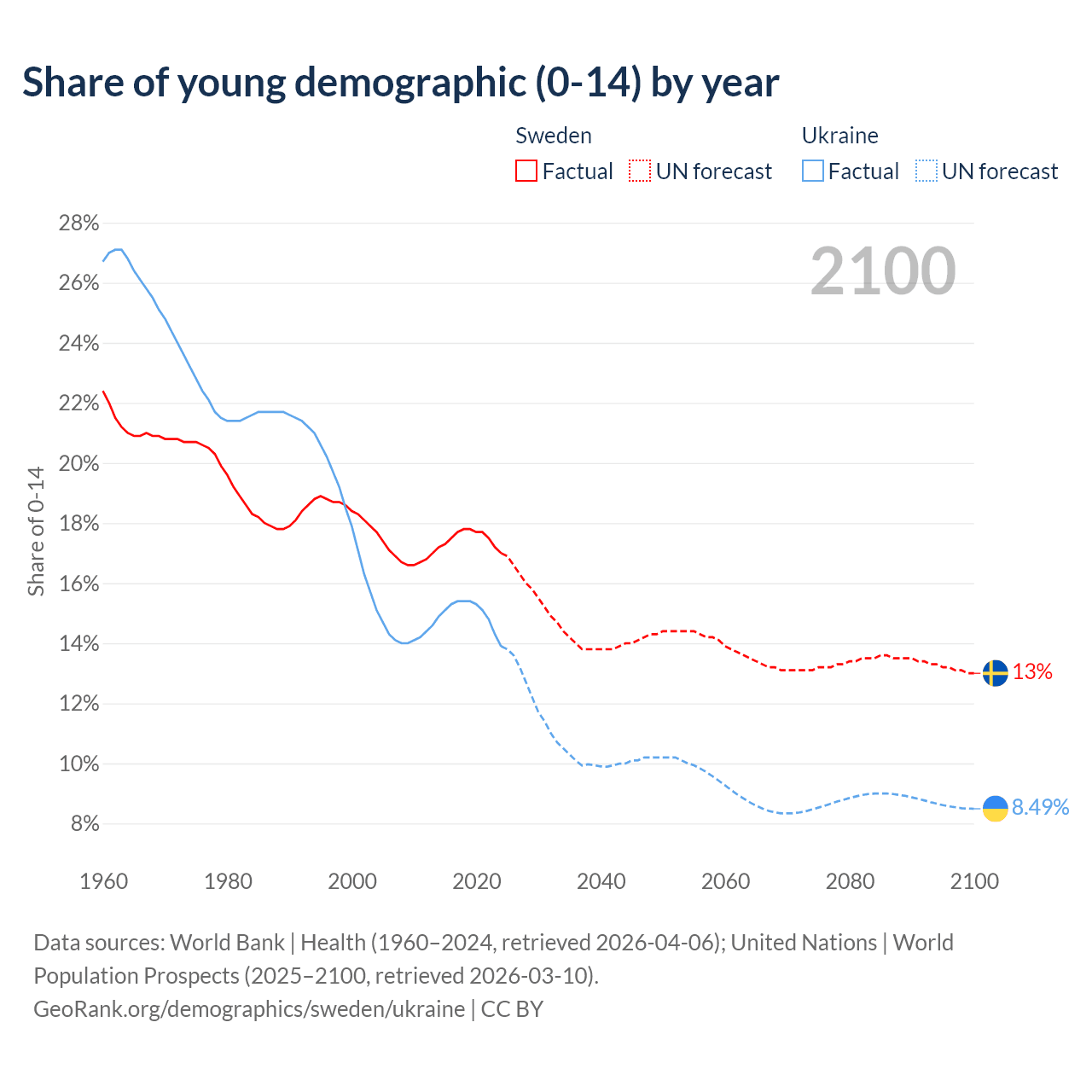 - The share of young demographic (0-15 years old) in Sweden is 17% vs 13.9% in Ukraine.