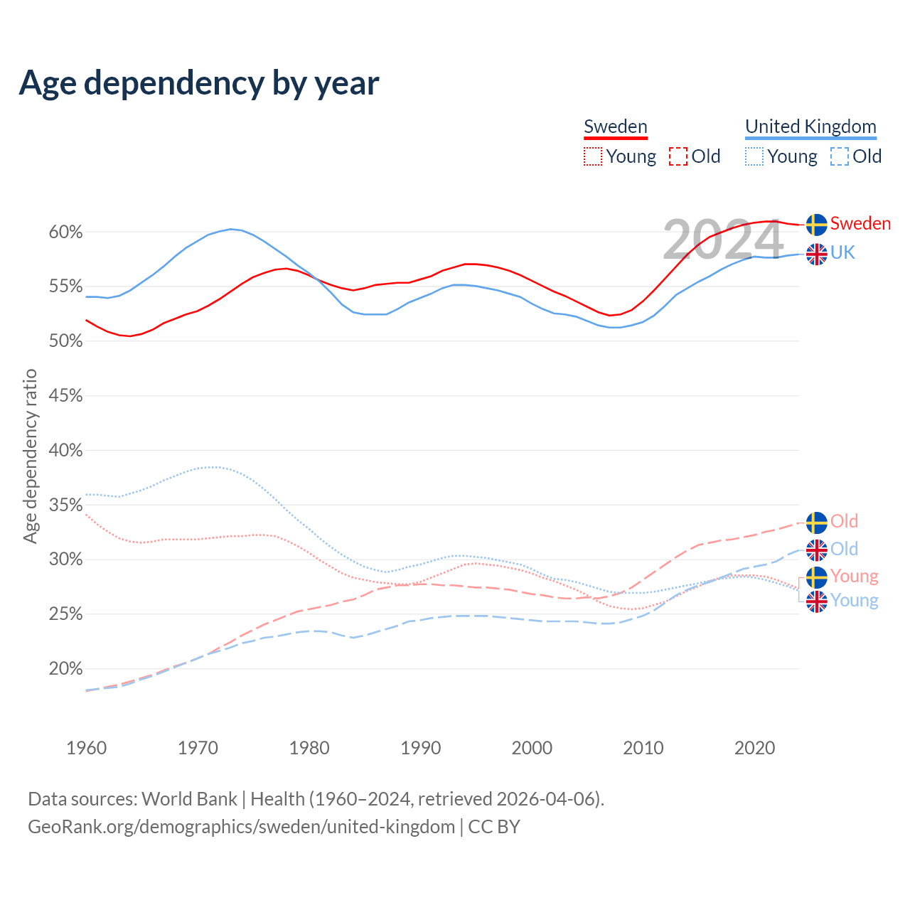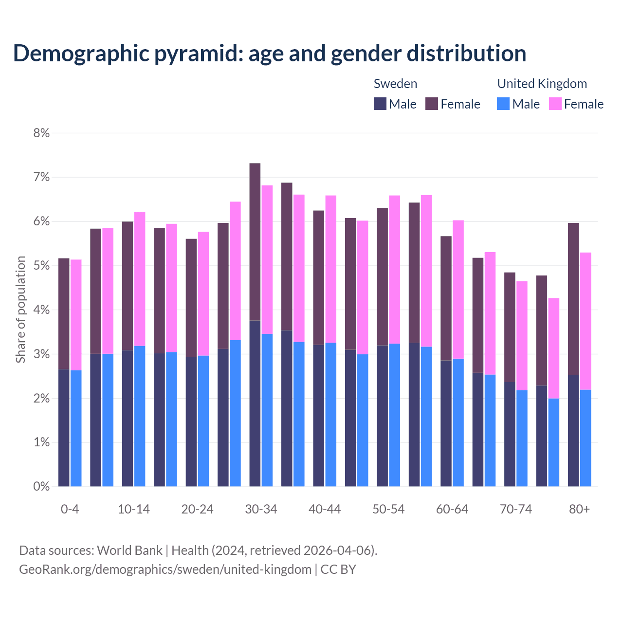 - Sweden is ranked 39/196 by median age (oldest to youngest) vs 41/196 for the United Kingdom.