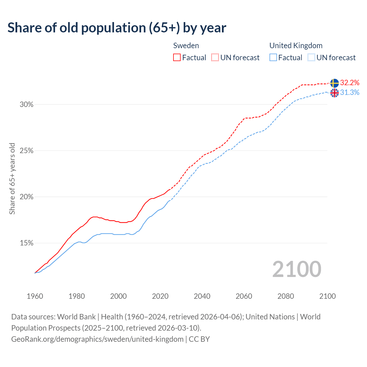 The share of older people aged 65 and over is 20.7% in Sweden and 19.5% in the United Kingdom. Life expectancy in Sweden compared to the United Kingdom .