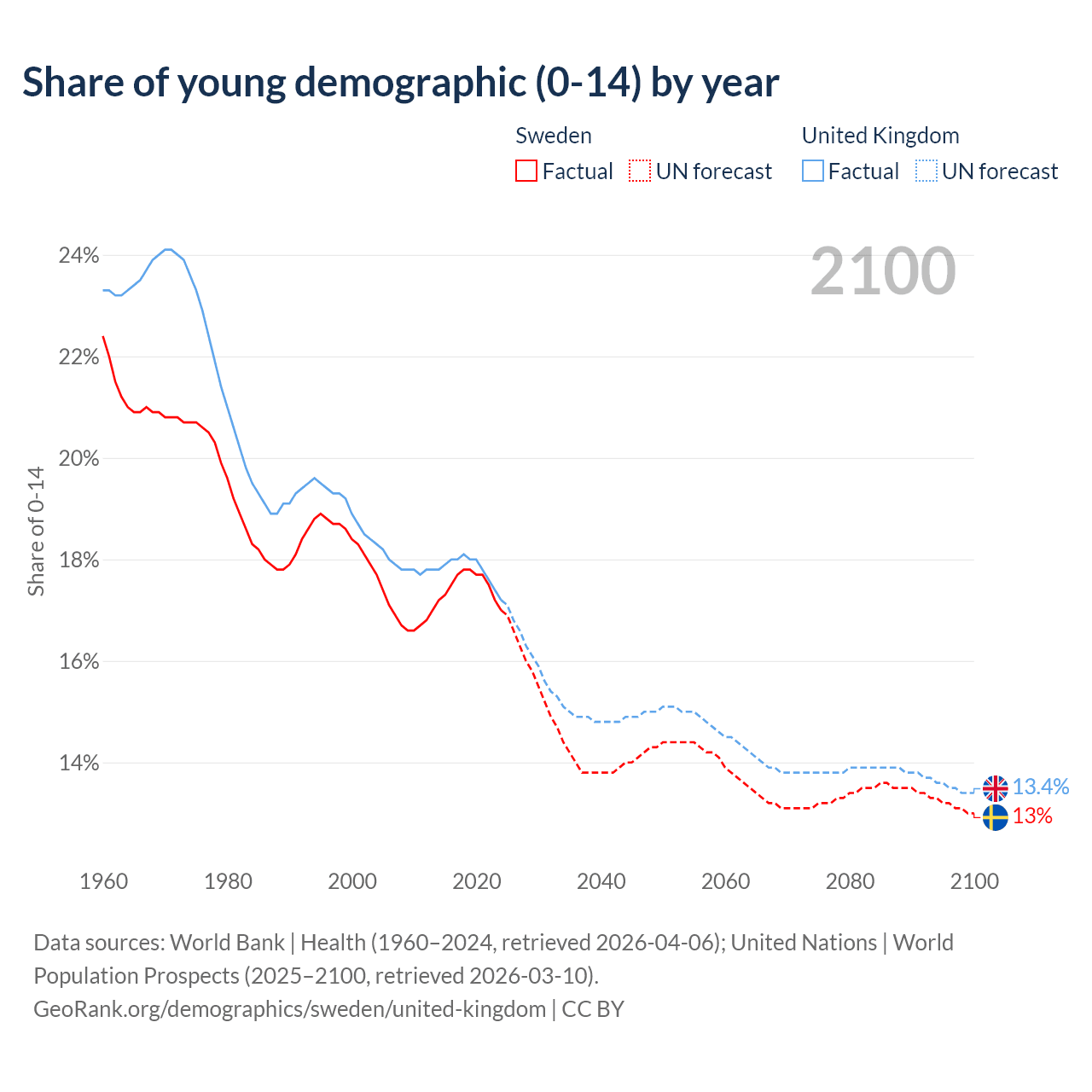 - The share of young demographic (0-15 years old) in Sweden is 17% vs 17.2% in the United Kingdom.