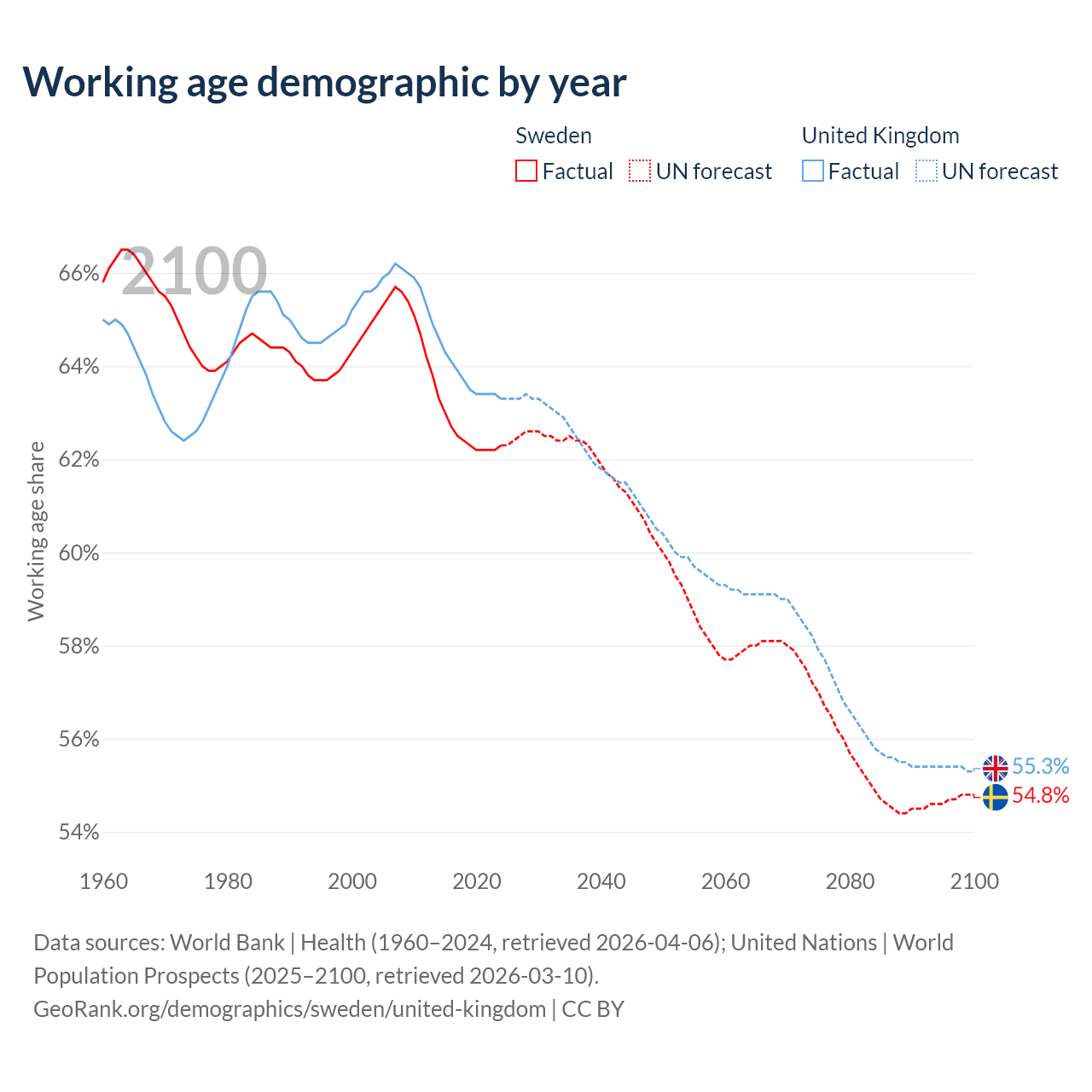 - Sweden has 6.65M working age adults (aged 15-64) vs 44.4M in the United Kingdom.