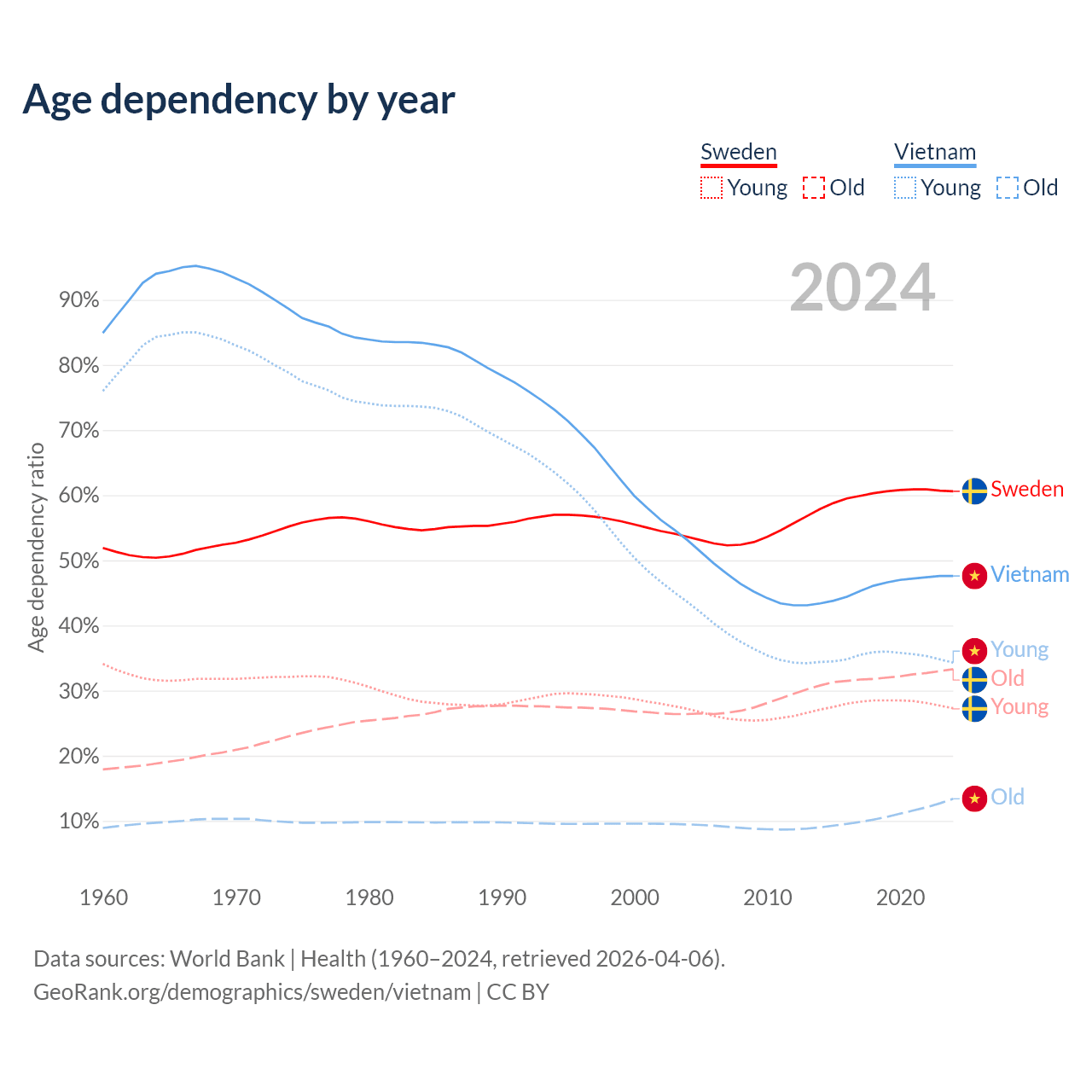 - Sweden is ranked 39/196 by median age (oldest to youngest) vs 84/196 for Vietnam.