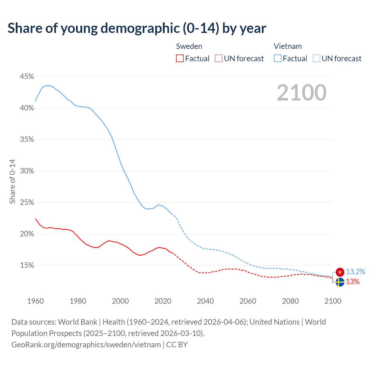 - The share of young demographic (0-15 years old) in Sweden is 17% vs 23.2% in Vietnam.