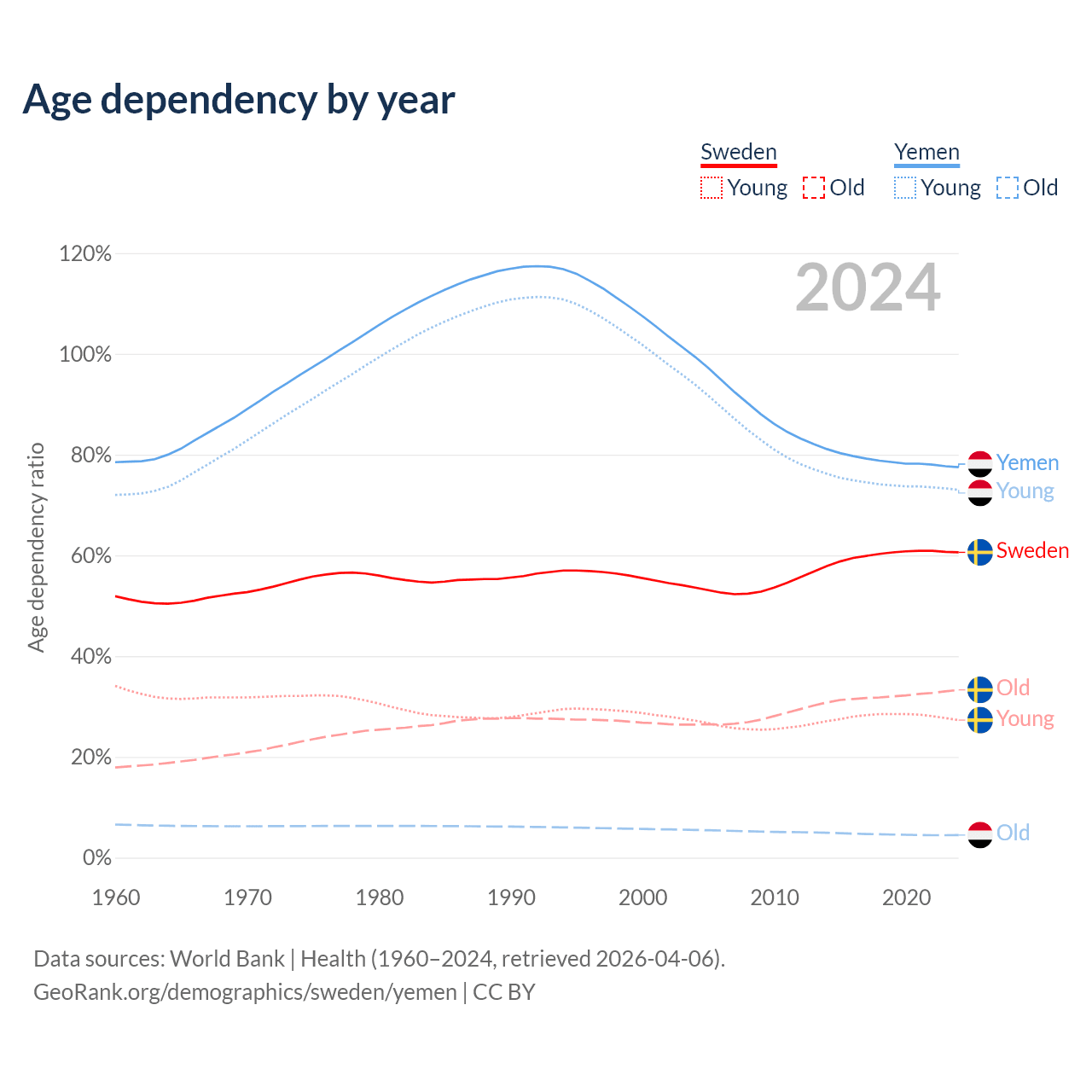 - The share of old-age demographic (65+) in Sweden is 20.7% vs 2.52% in Yemen.