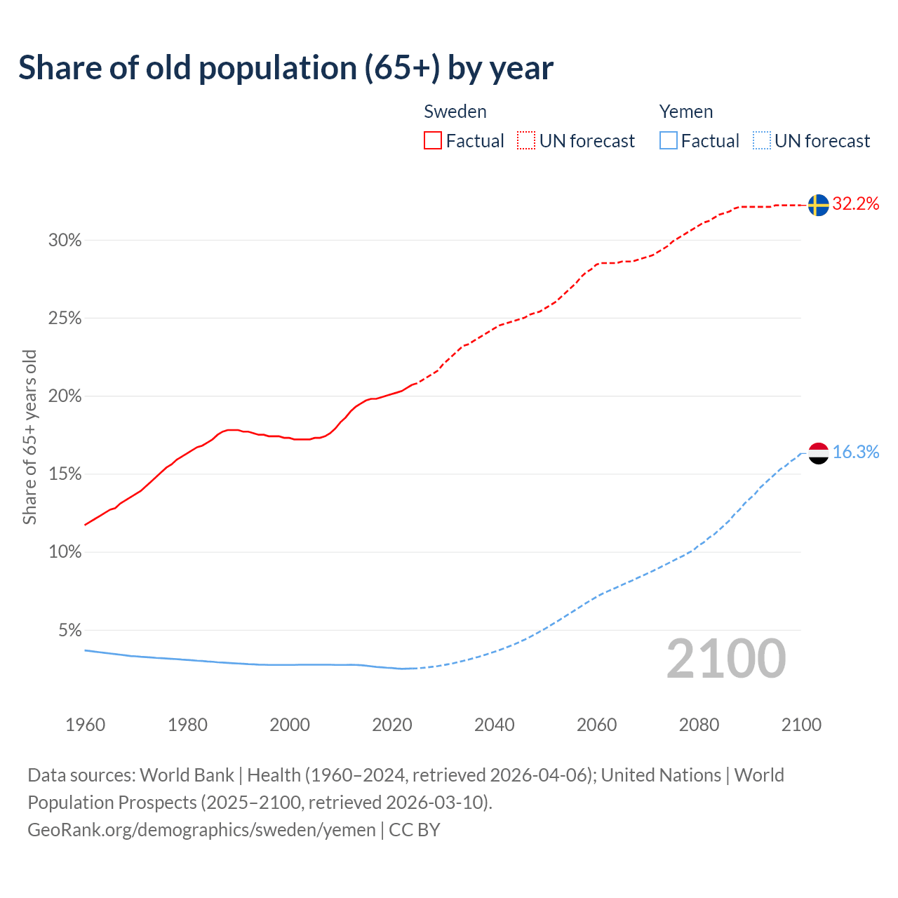 The share of older people aged 65 and over is 20.7% in Sweden and 2.52% in Yemen. Life expectancy in Sweden compared to Yemen .