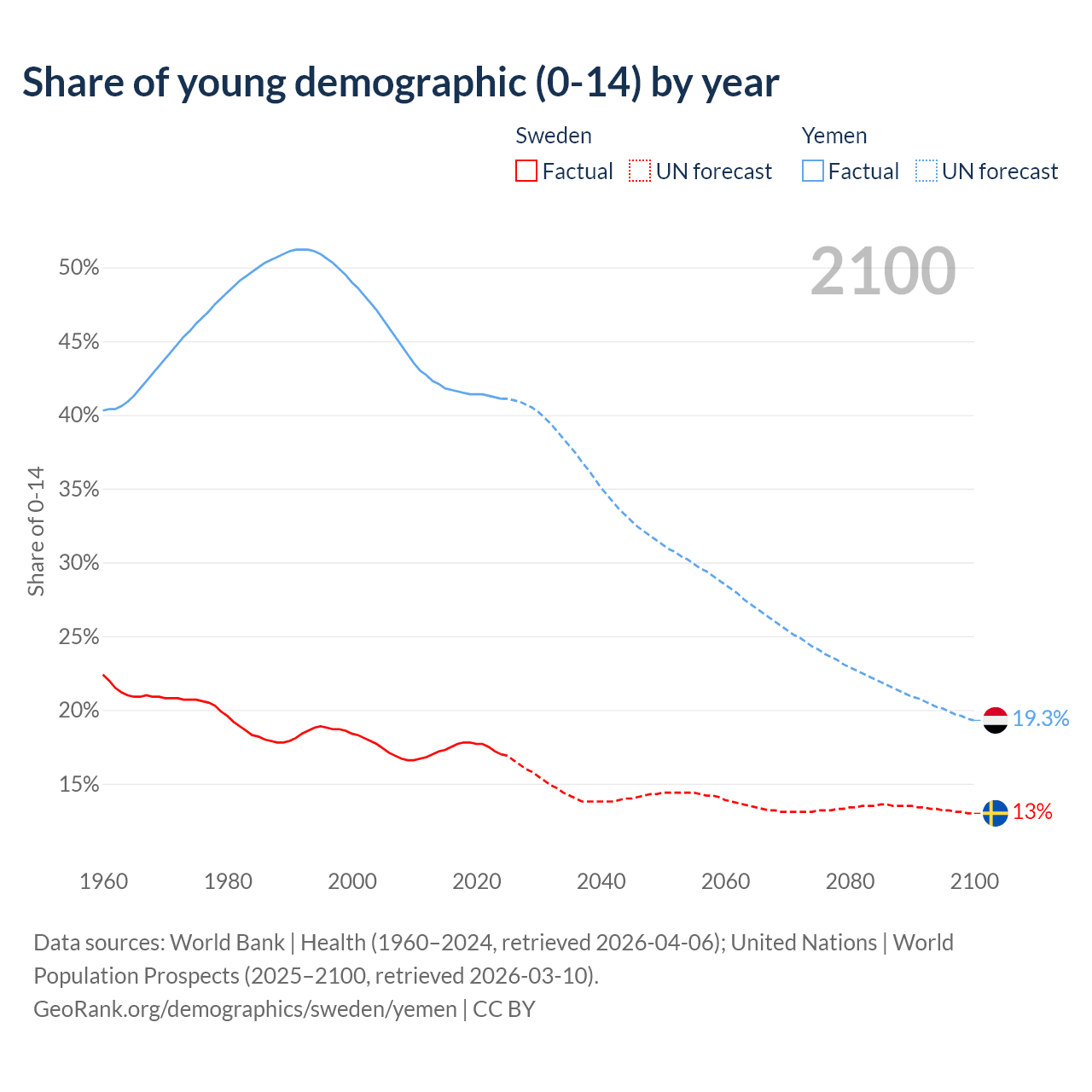 - The share of young demographic (0-15 years old) in Sweden is 17% vs 41.1% in Yemen.