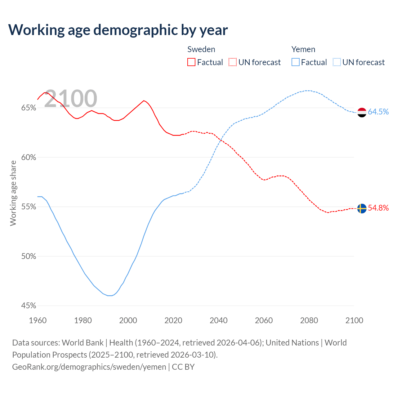 - Sweden has 6.65M working age adults (aged 15-64) vs 24.4M in Yemen.