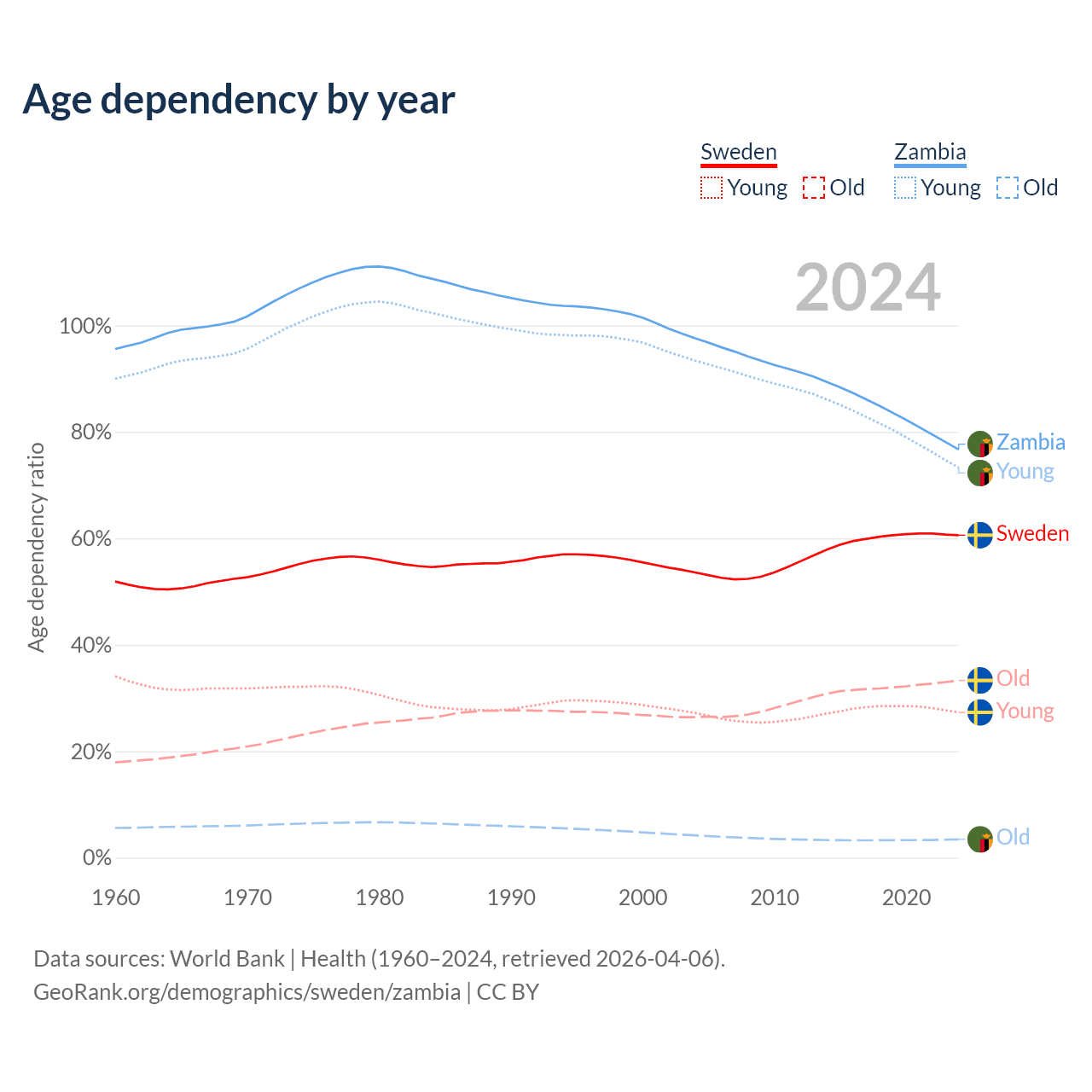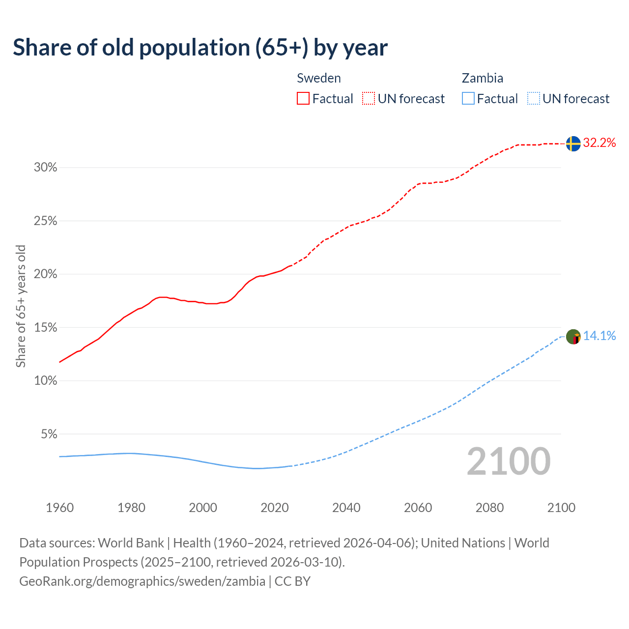 The share of older people aged 65 and over is 20.7% in Sweden and 1.95% in Zambia. Life expectancy in Sweden compared to Zambia .
