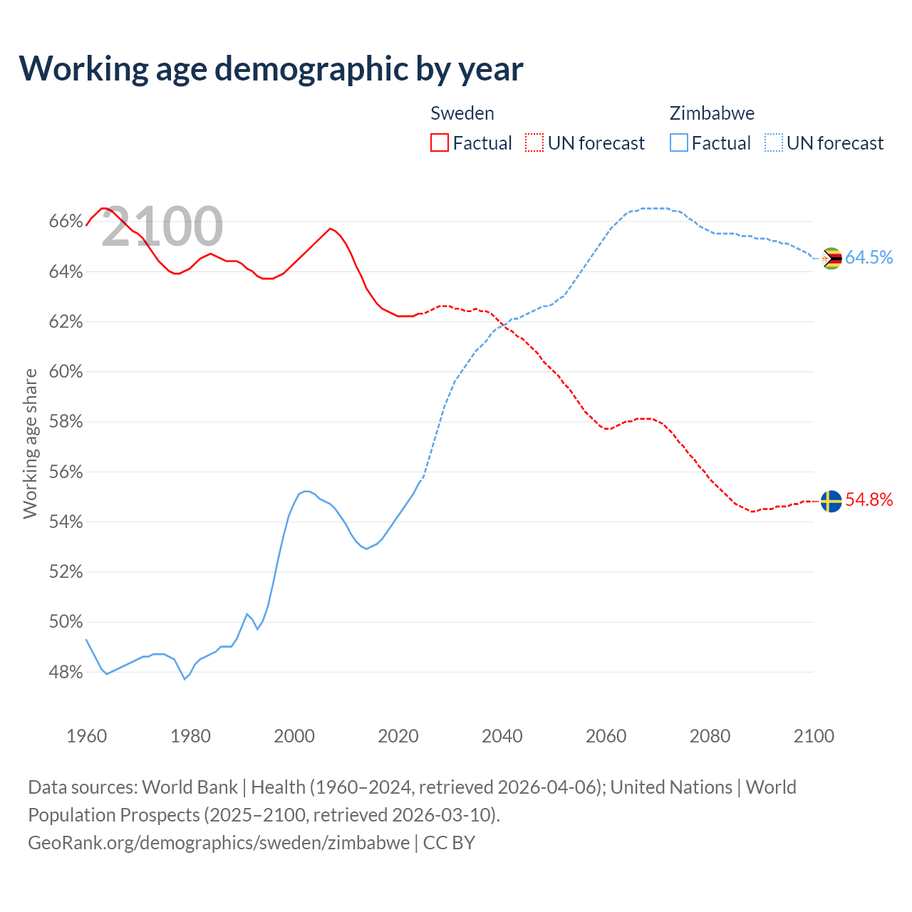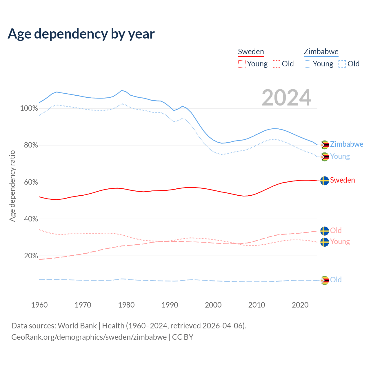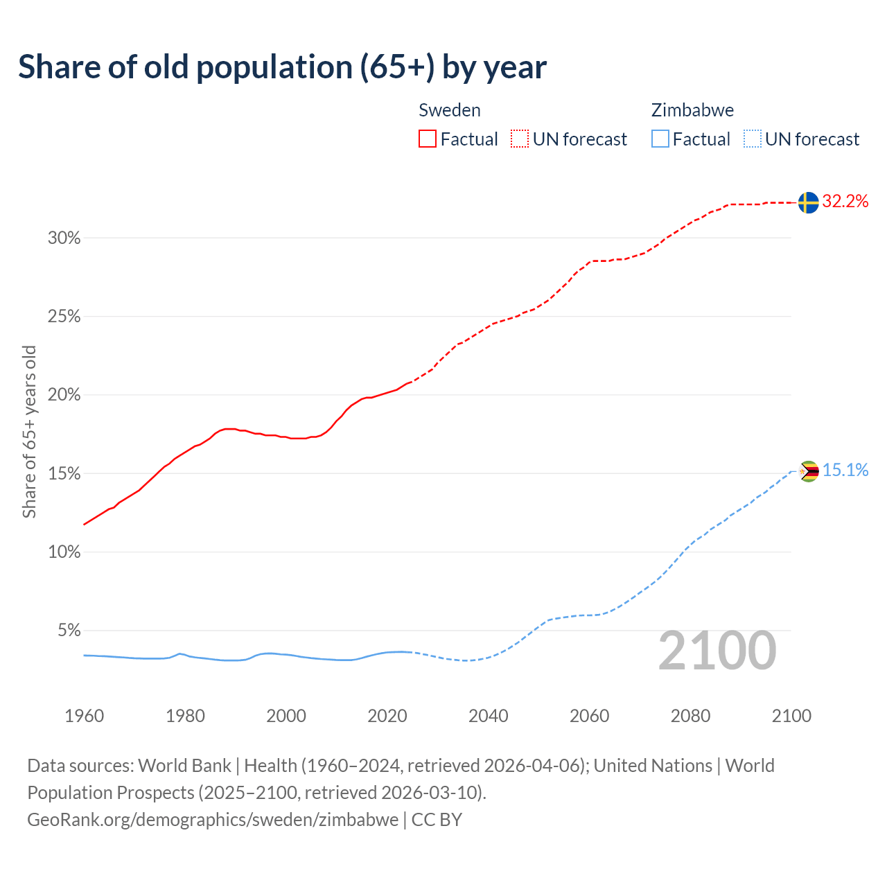 The share of older people aged 65 and over is 20.7% in Sweden and 3.6% in Zimbabwe. Life expectancy in Sweden compared to Zimbabwe .
