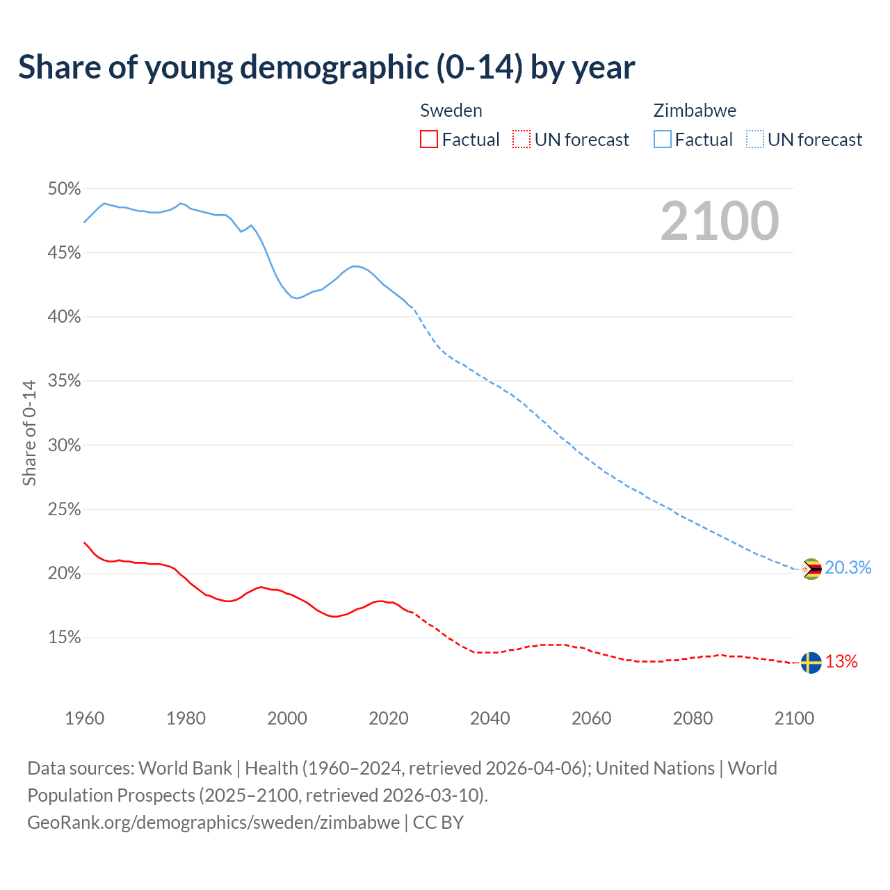 - The share of young demographic (0-15 years old) in Sweden is 17% vs 40.9% in Zimbabwe.
