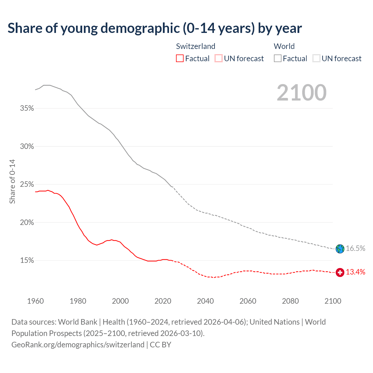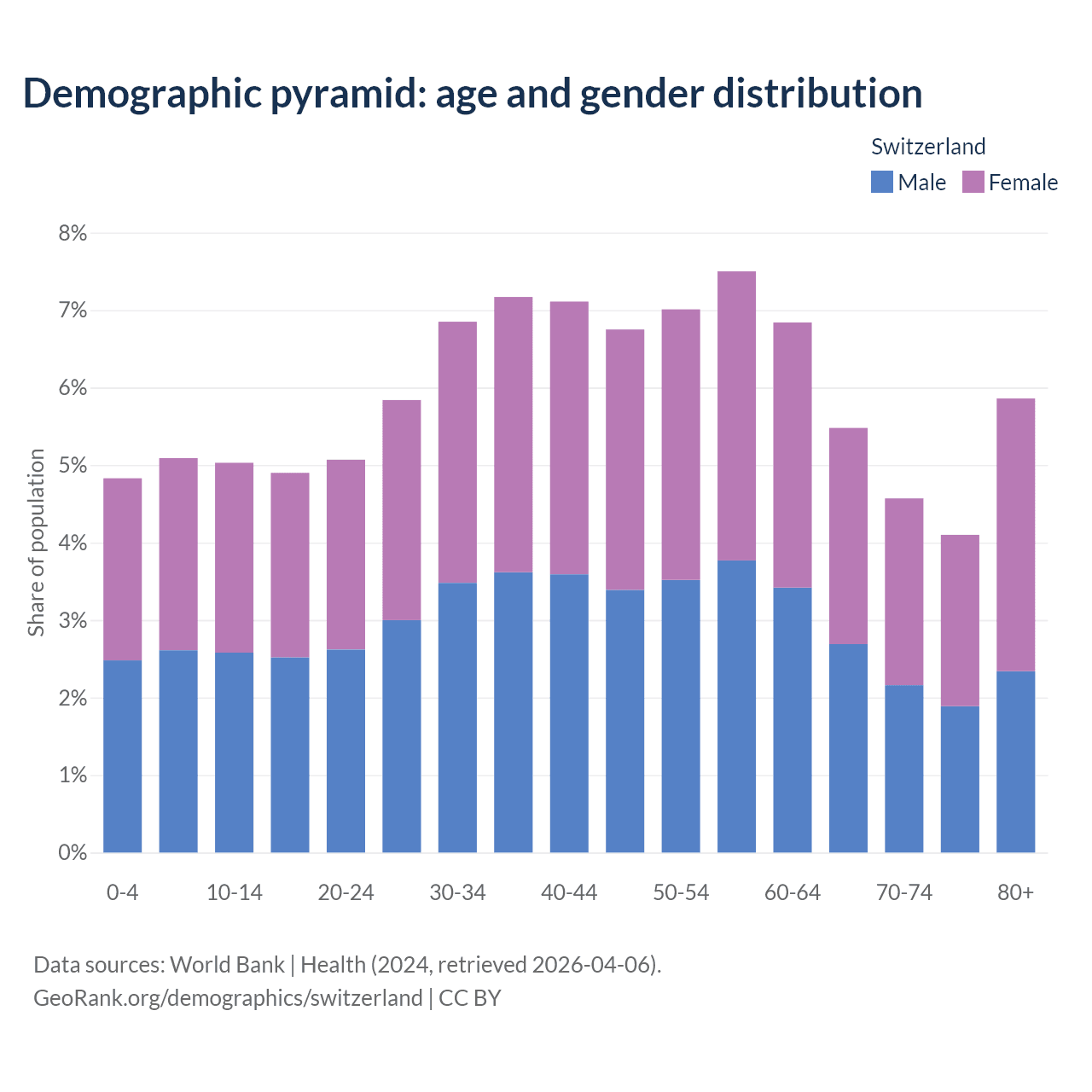 With a population of 9.01M people, Switzerland has a median age of 43.7 years which makes it the 24/196 oldest country. 15% of the demographic are children 0-14 years old, 65% are working-age people aged 15-64, and 20% are older population aged 65+ years.