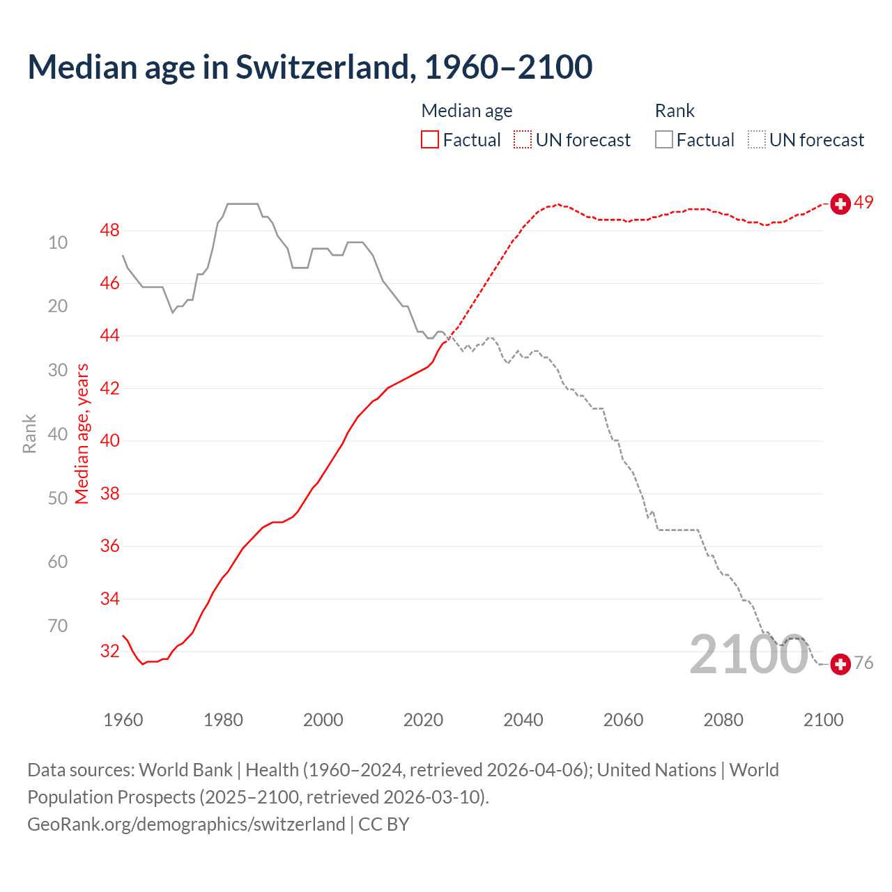 Median age in Switzerland, 1960–2100
