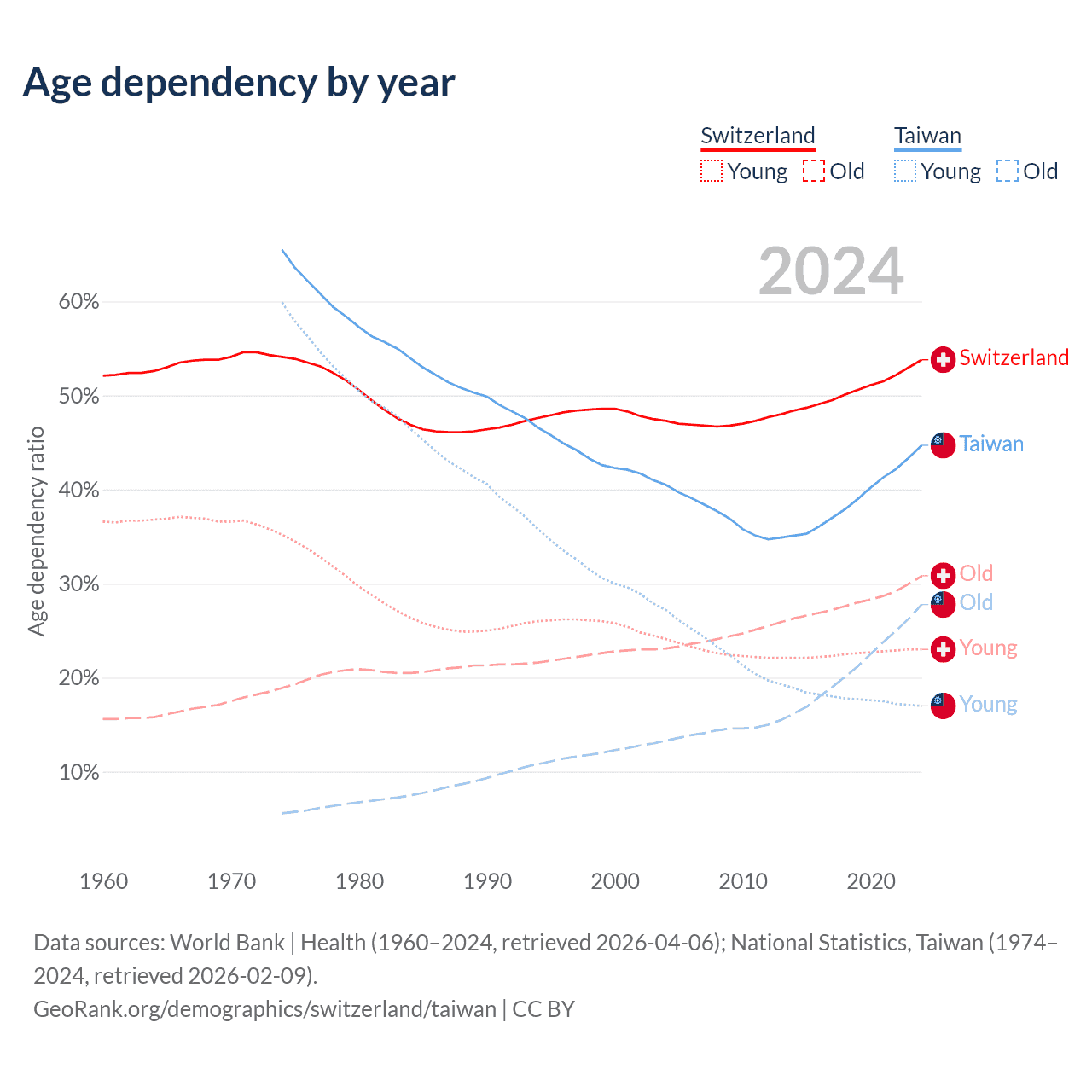 Data sources: World Bank | Health (1960–2024, retrieved 2026-04-06); U.S. Census Bureau (1960–2024, retrieved 2026-02-08); National Statistics, Taiwan (1974–2024, retrieved 2026-02-09).