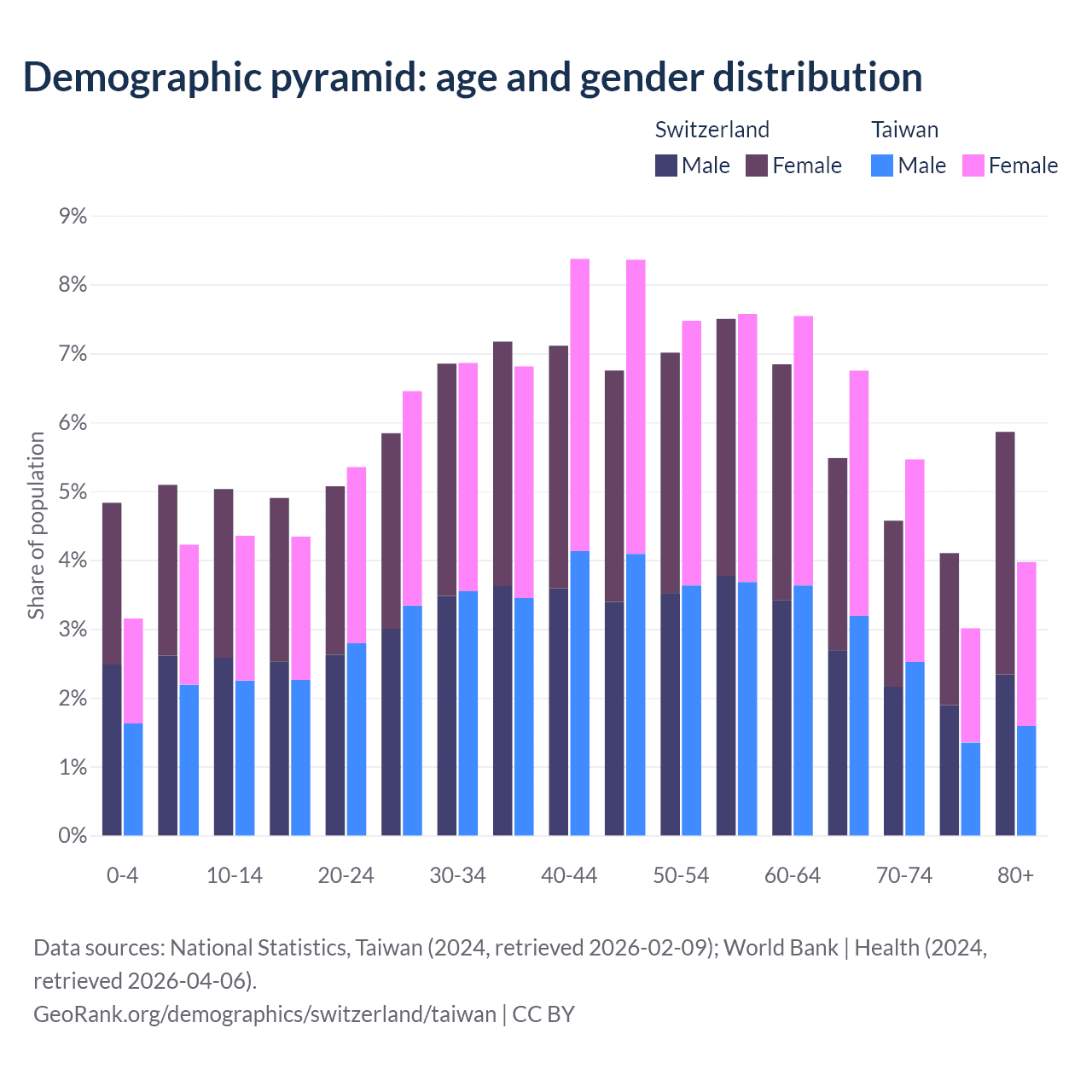 - Switzerland is ranked 24/196 by median age (oldest to youngest) vs 16/196 for Taiwan.