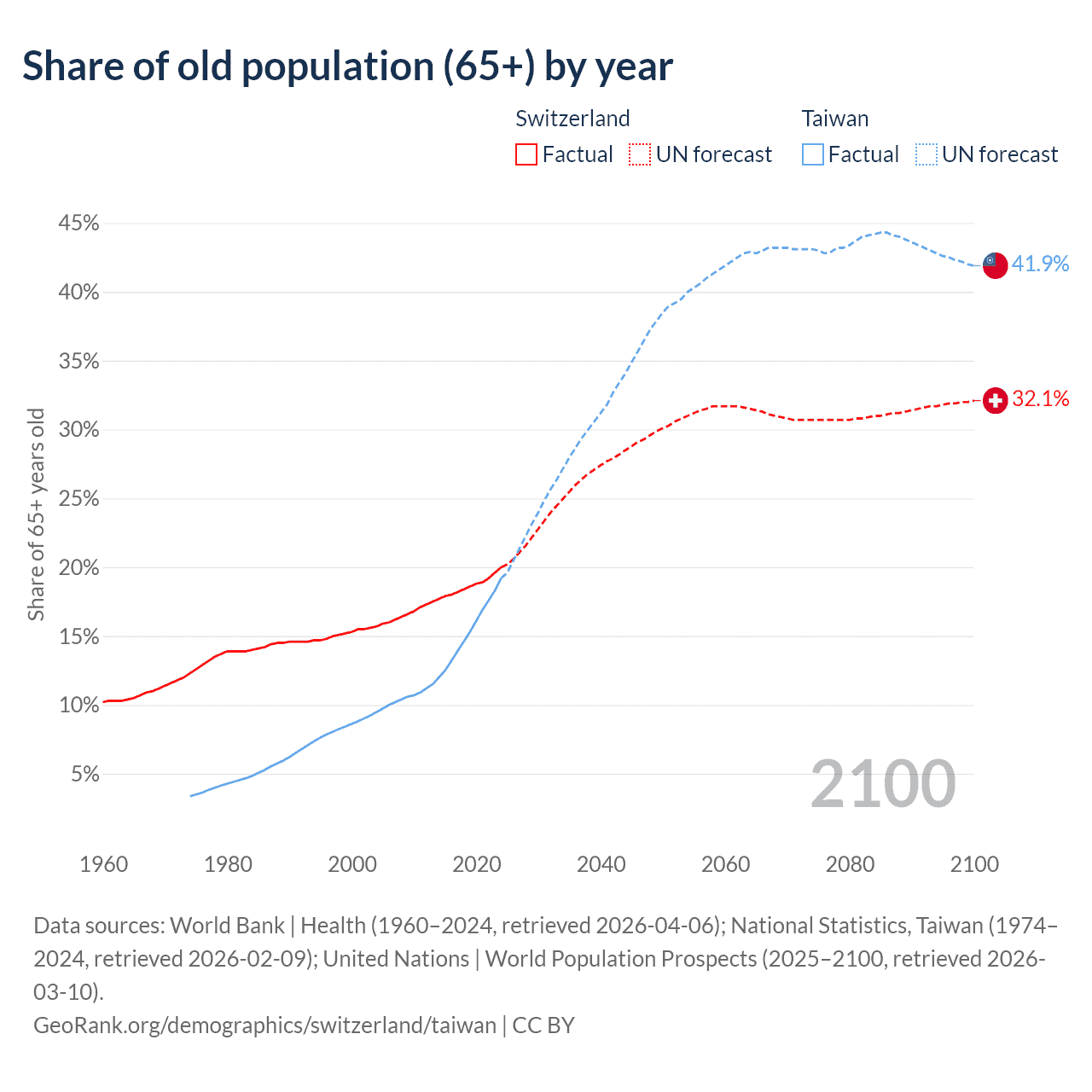 The share of older people aged 65 and over is 20% in Switzerland and 19.2% in Taiwan. Life expectancy in Switzerland compared to Taiwan .