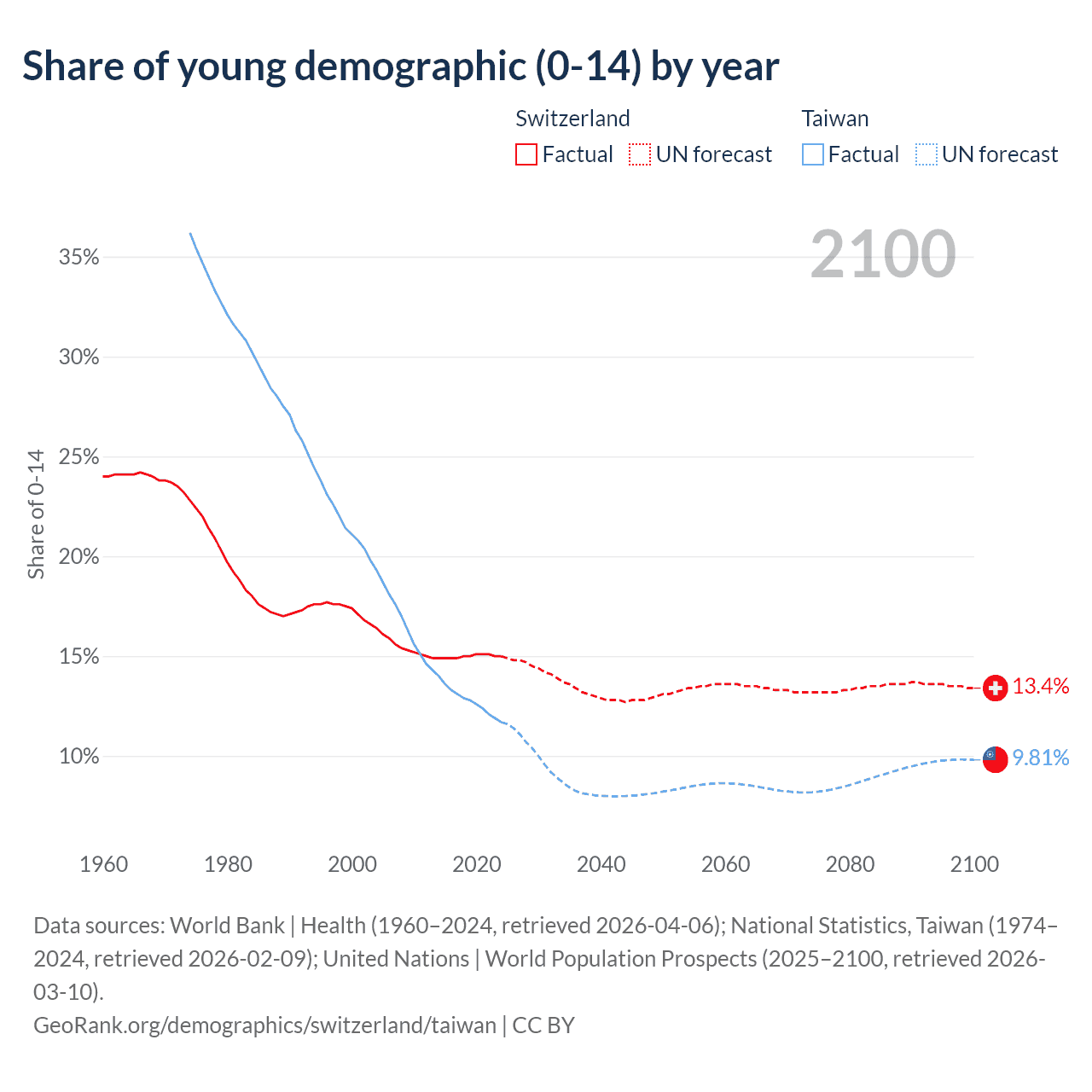 - The share of young demographic (0-15 years old) in Switzerland is 15% vs 11.7% in Taiwan.