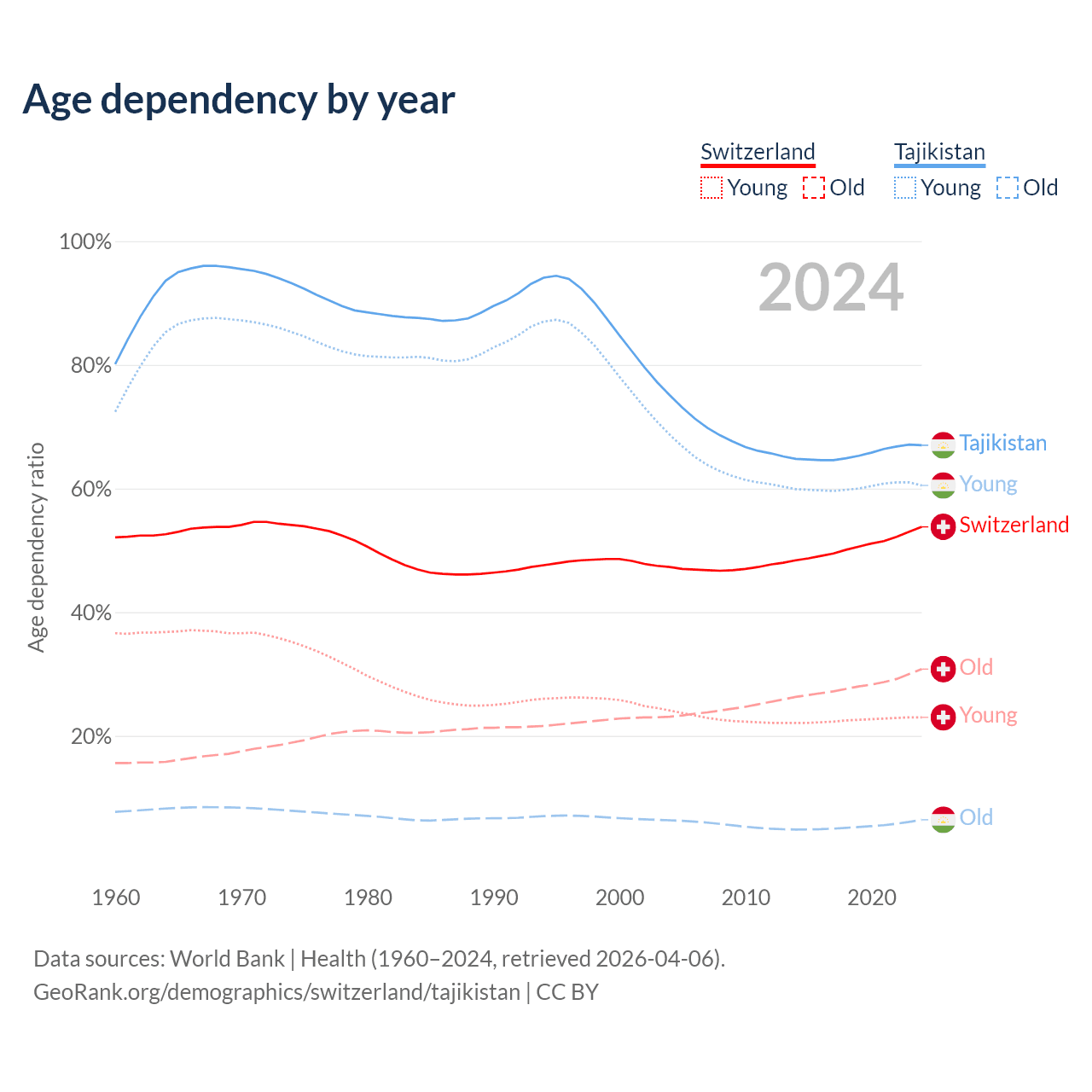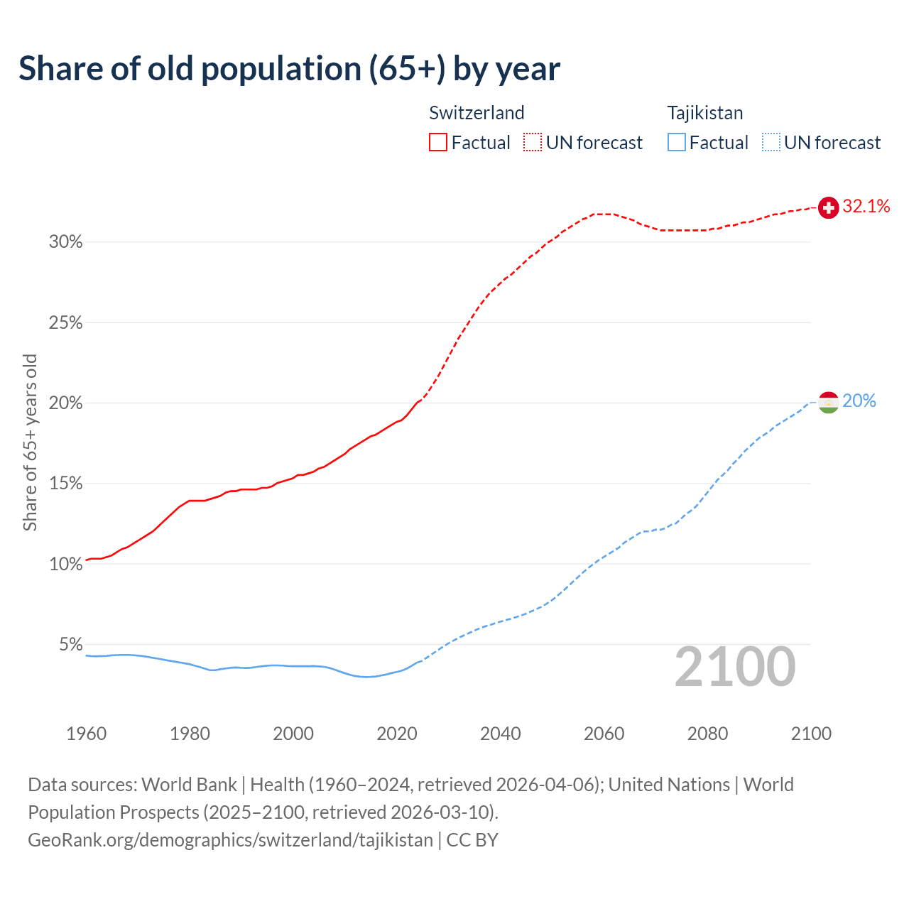 The share of older people aged 65 and over is 20% in Switzerland and 3.85% in Tajikistan. Life expectancy in Switzerland compared to Tajikistan .