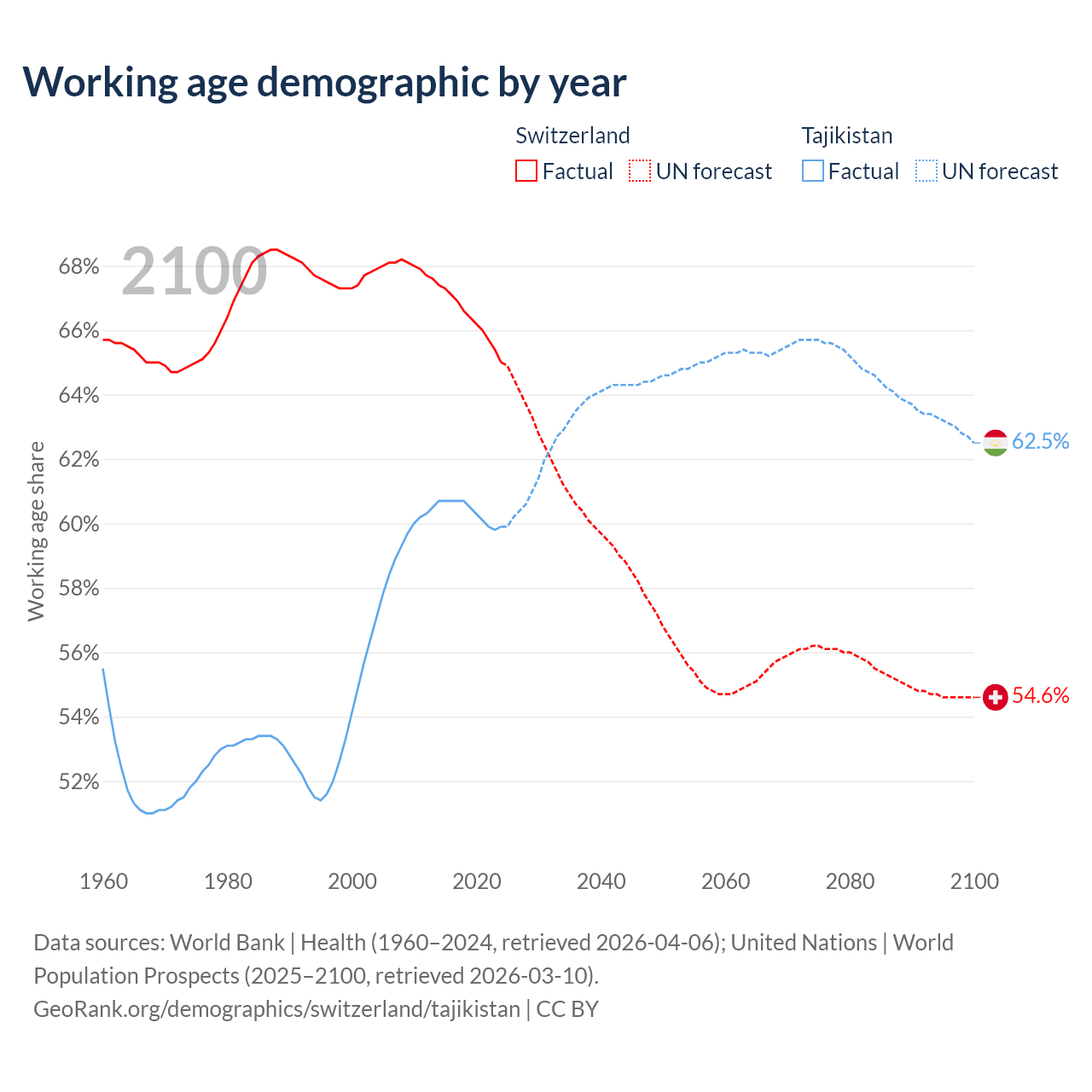 Median age Switzerland vs Tajikistan, 1960-2100