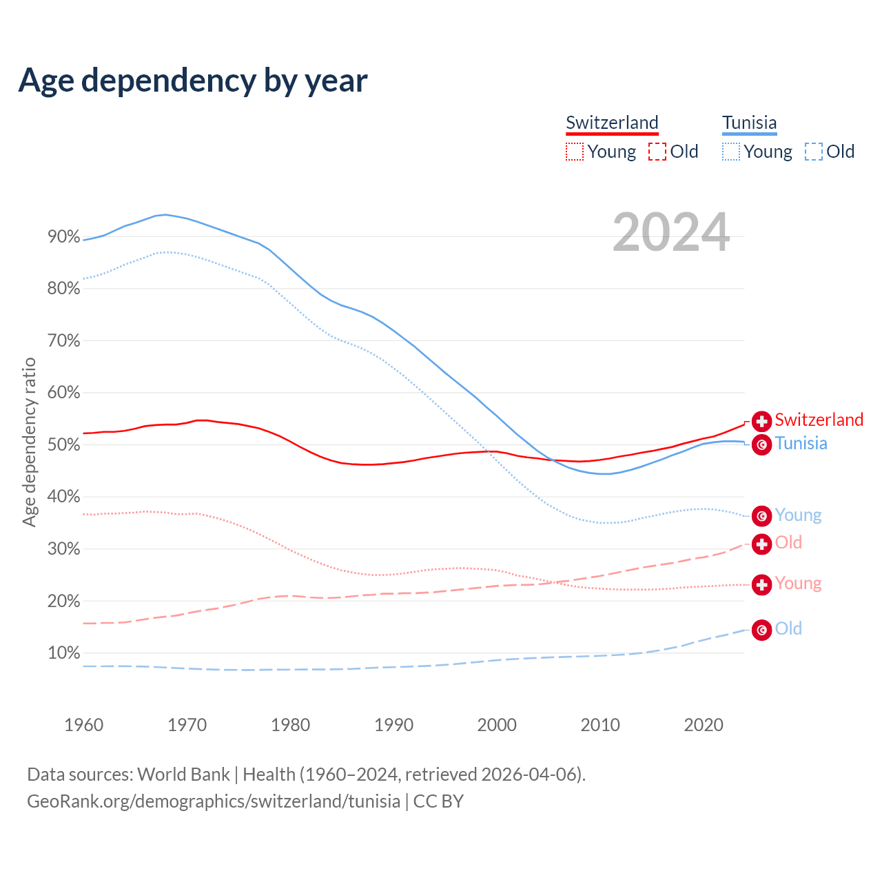 The share of older people aged 65 and over is 20% in Switzerland and 9.53% in Tunisia. Life expectancy in Switzerland compared to Tunisia .