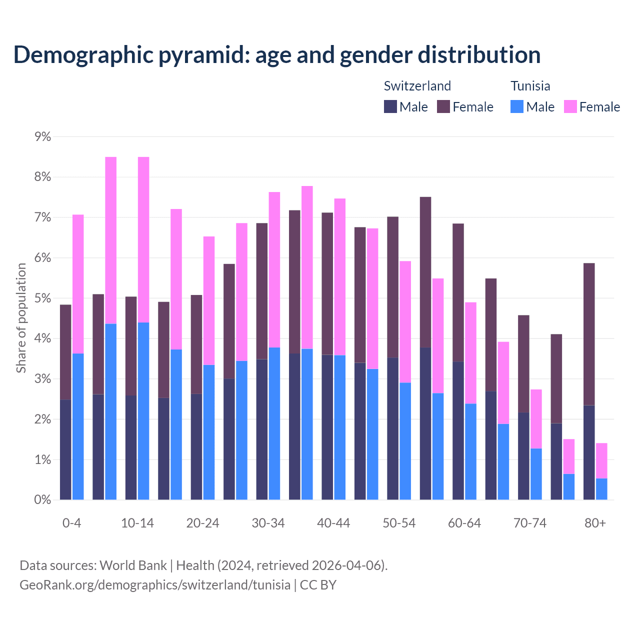 - Switzerland is ranked 24/196 by median age (oldest to youngest) vs 86/196 for Tunisia.