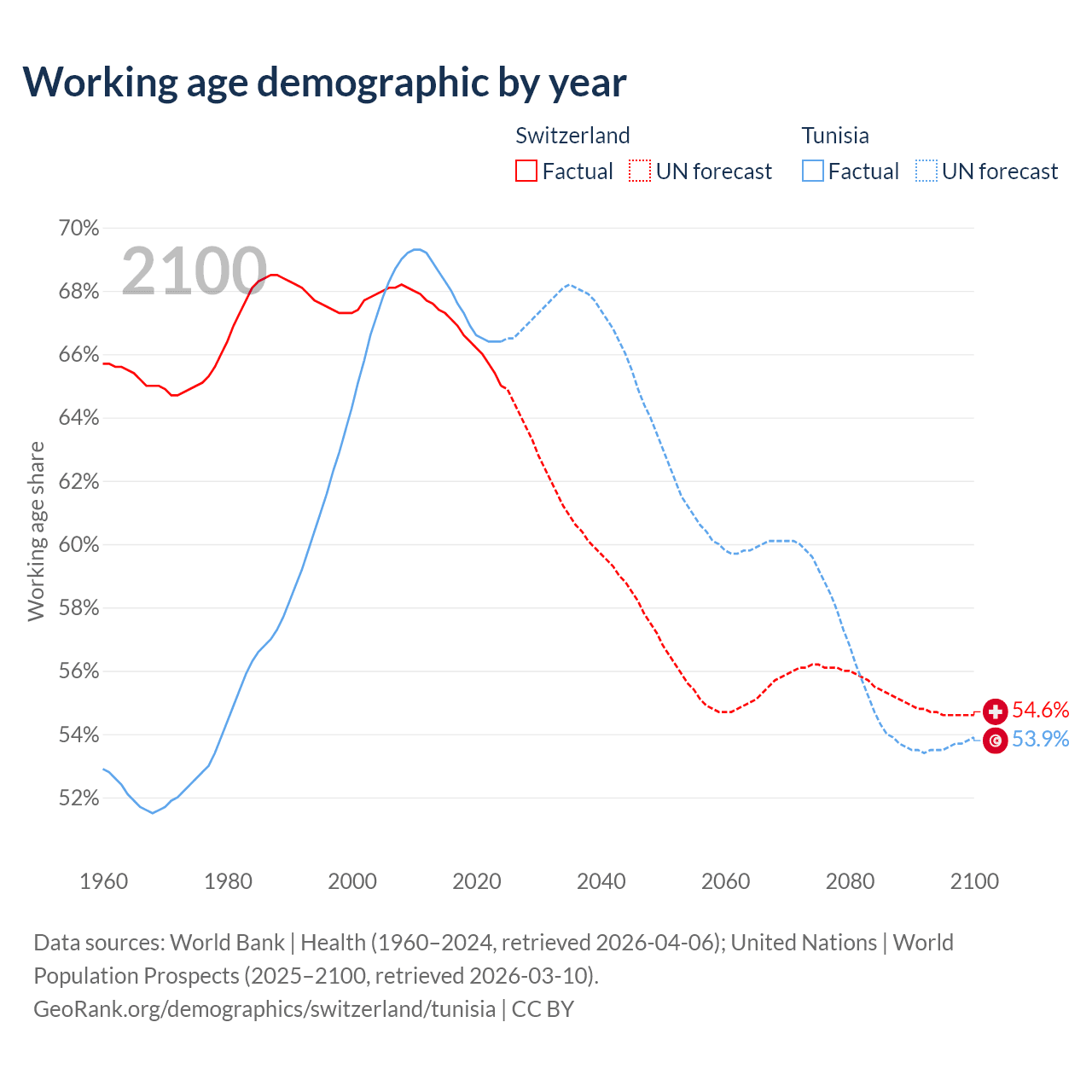 - Switzerland has 5.92M working age adults (aged 15-64) vs 8.26M in Tunisia.
