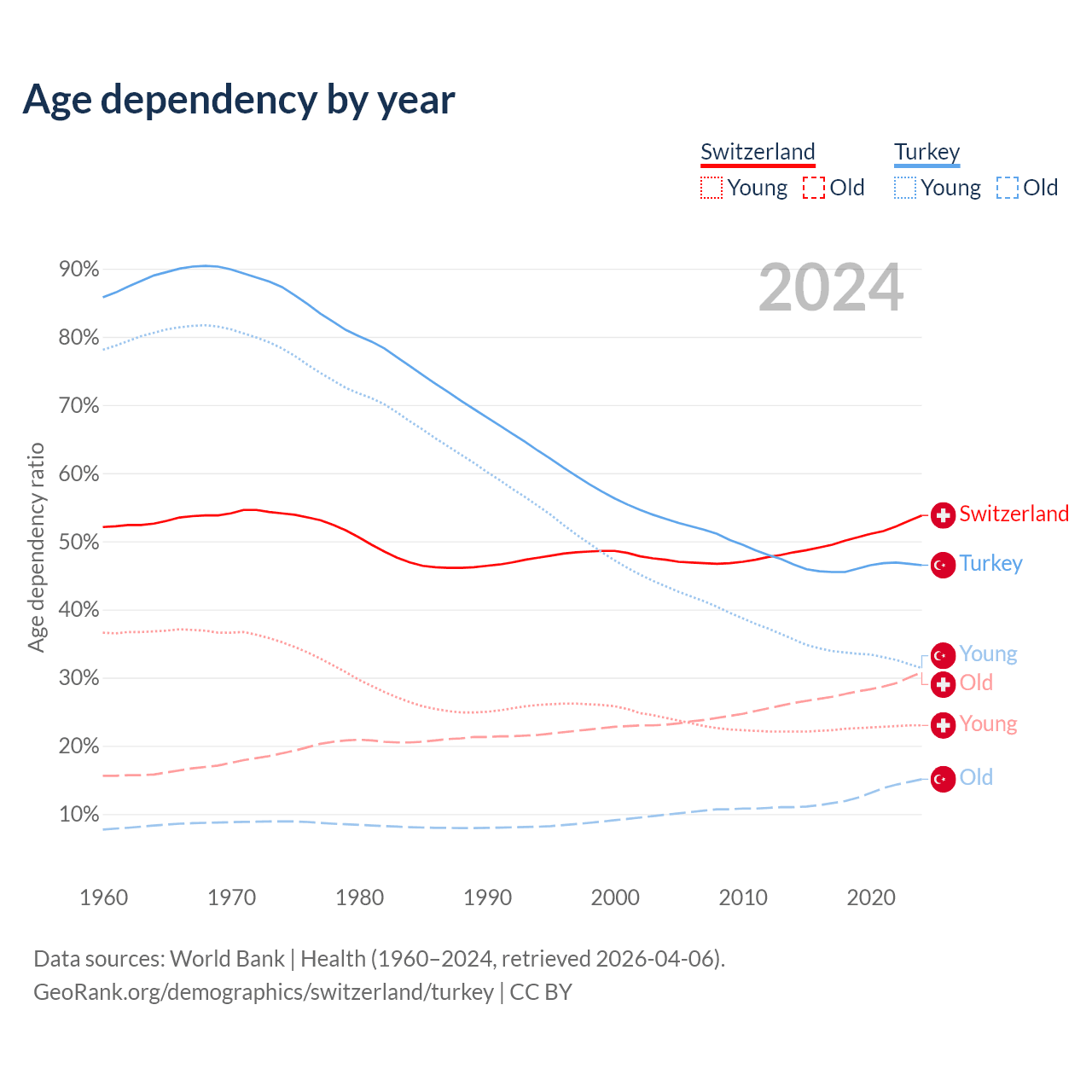 The share of older people aged 65 and over is 20% in Switzerland and 10.3% in Turkey. Life expectancy in Switzerland compared to Turkey .
