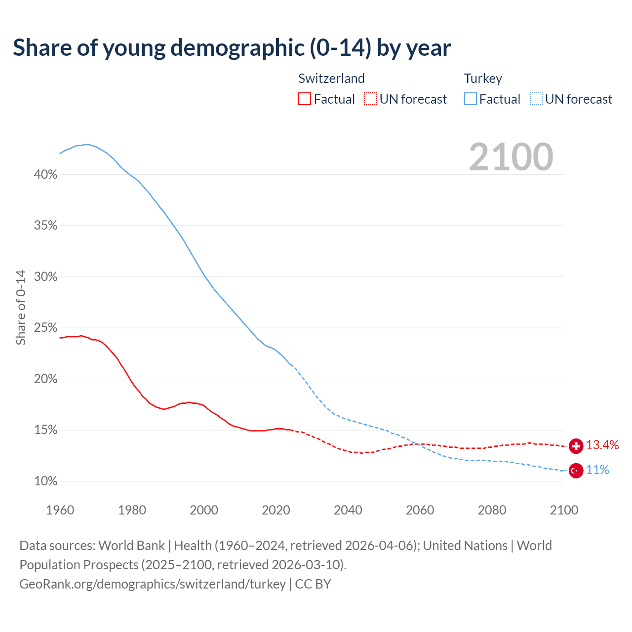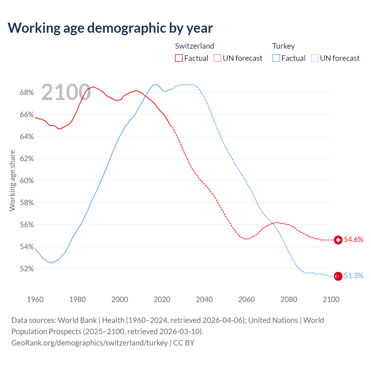 Median age Switzerland vs Turkey, 1960-2100