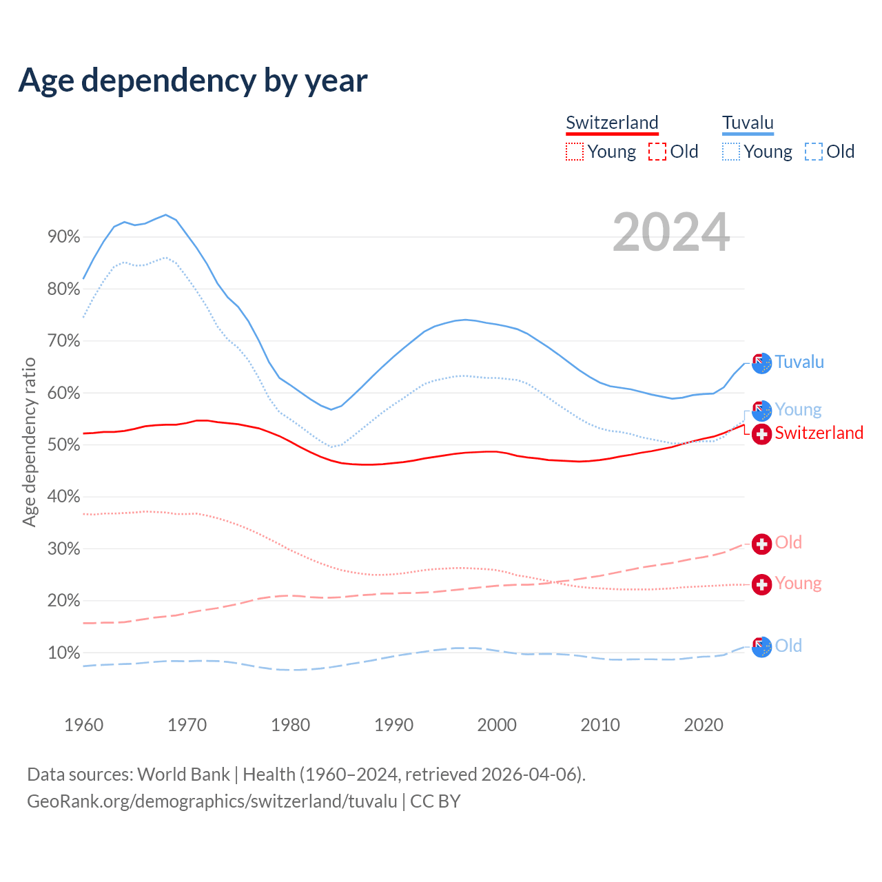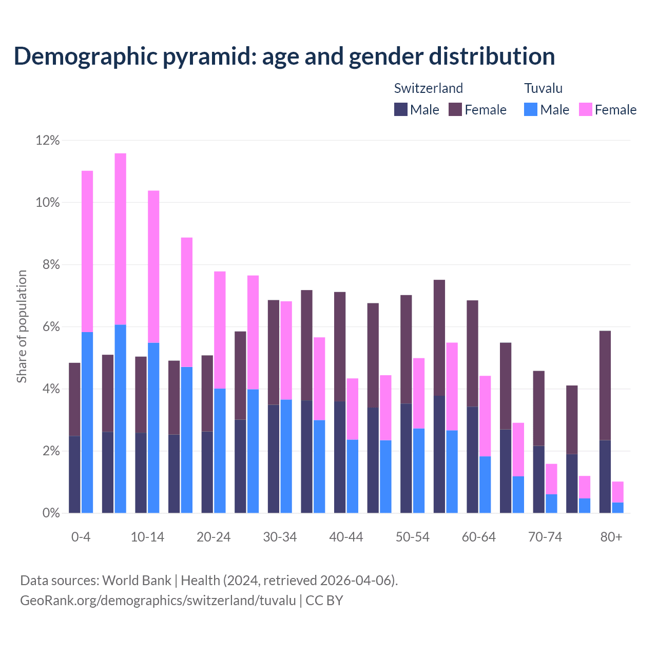 The share of older people aged 65 and over is 20% in Switzerland and 6.67% in Tuvalu. Life expectancy in Switzerland compared to Tuvalu .