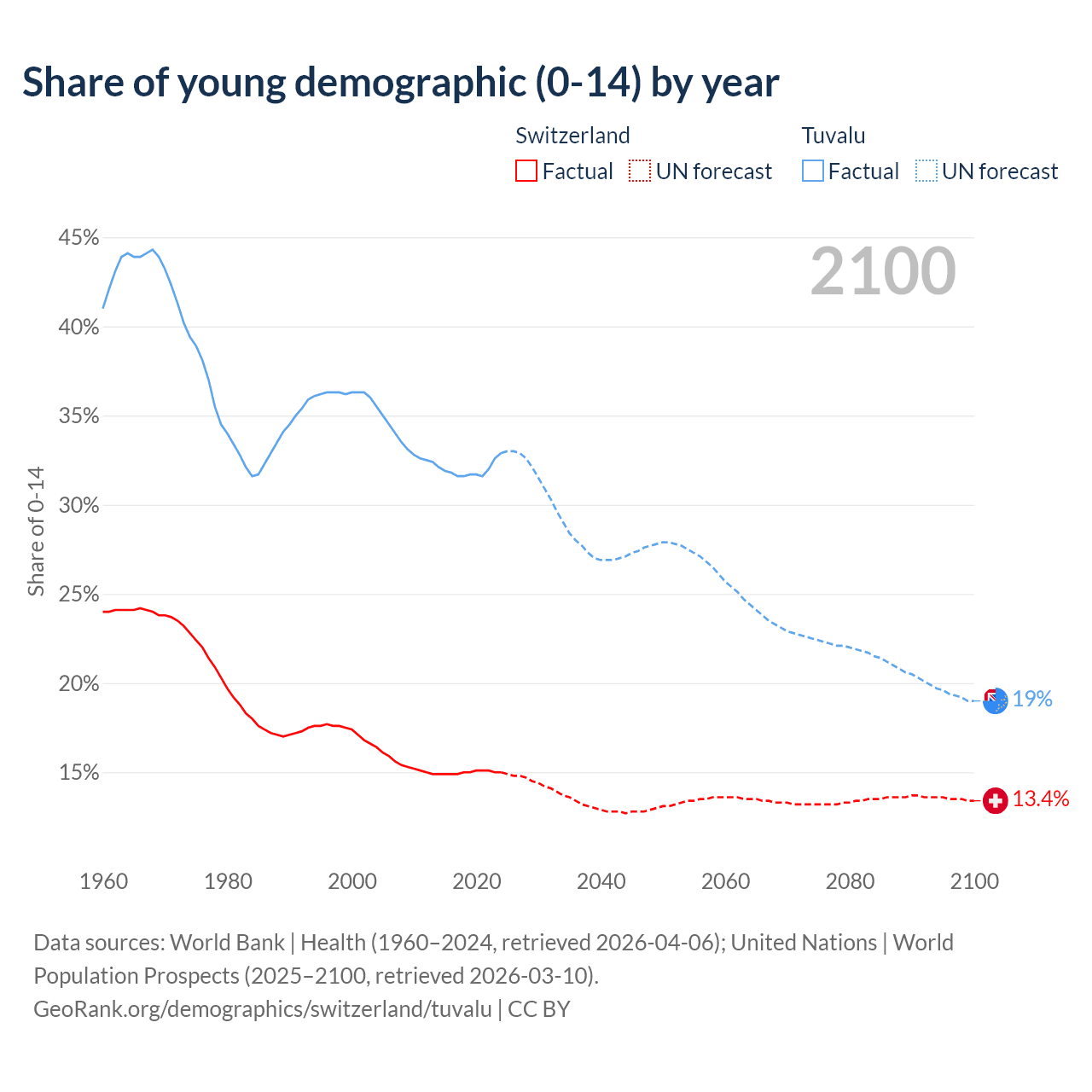 - The share of young demographic (0-15 years old) in Switzerland is 15% vs 32.9% in Tuvalu.