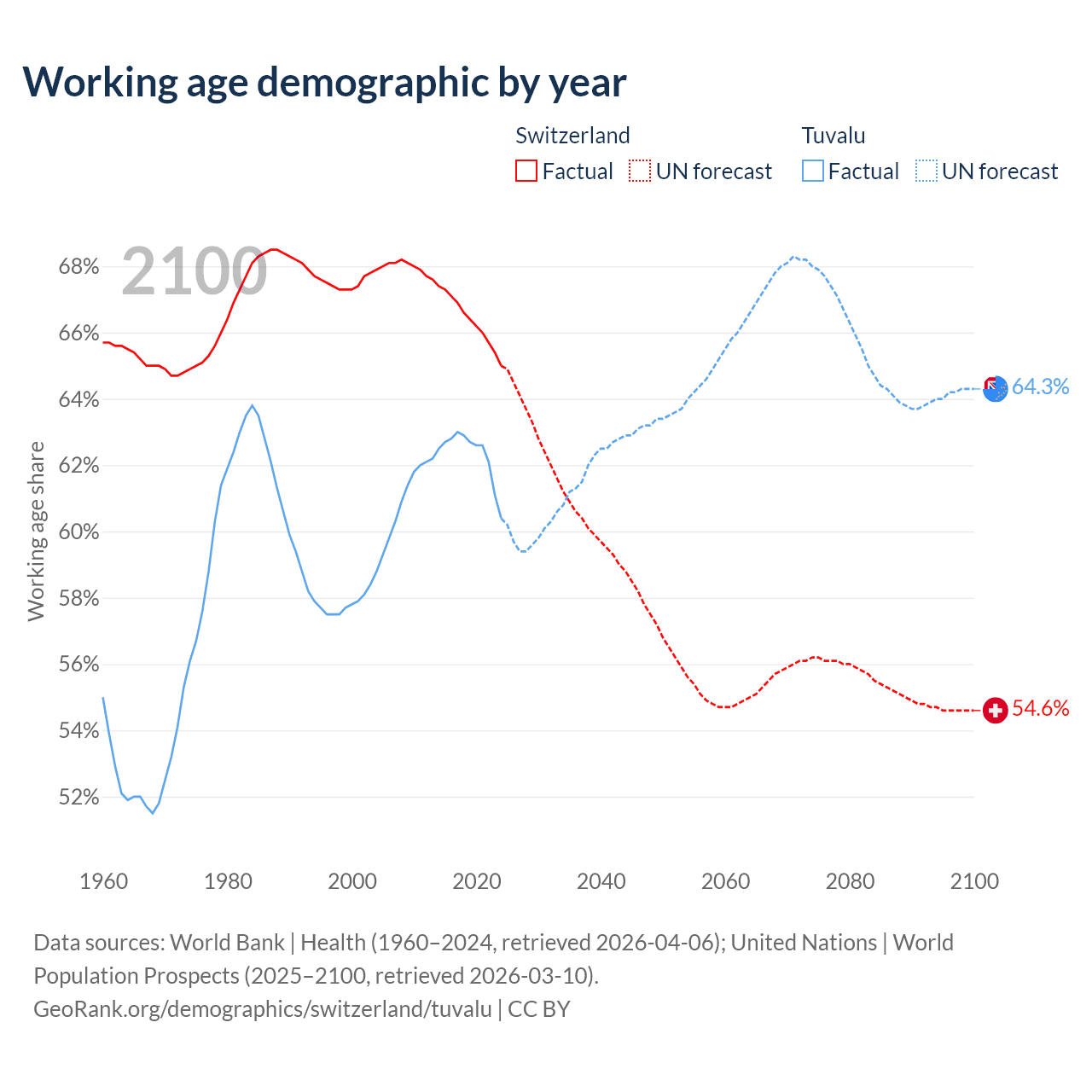 - Switzerland has 5.92M working age adults (aged 15-64) vs 5.64K in Tuvalu.