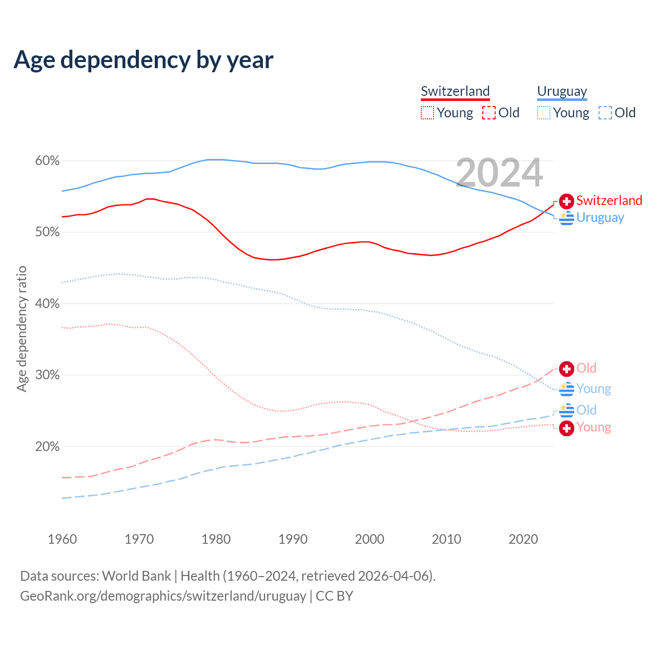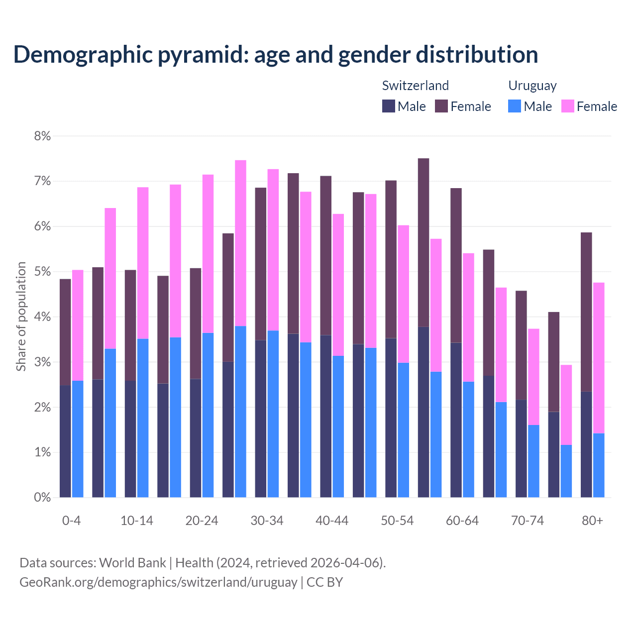 The share of older people aged 65 and over is 20% in Switzerland and 16% in Uruguay. Life expectancy in Switzerland compared to Uruguay .