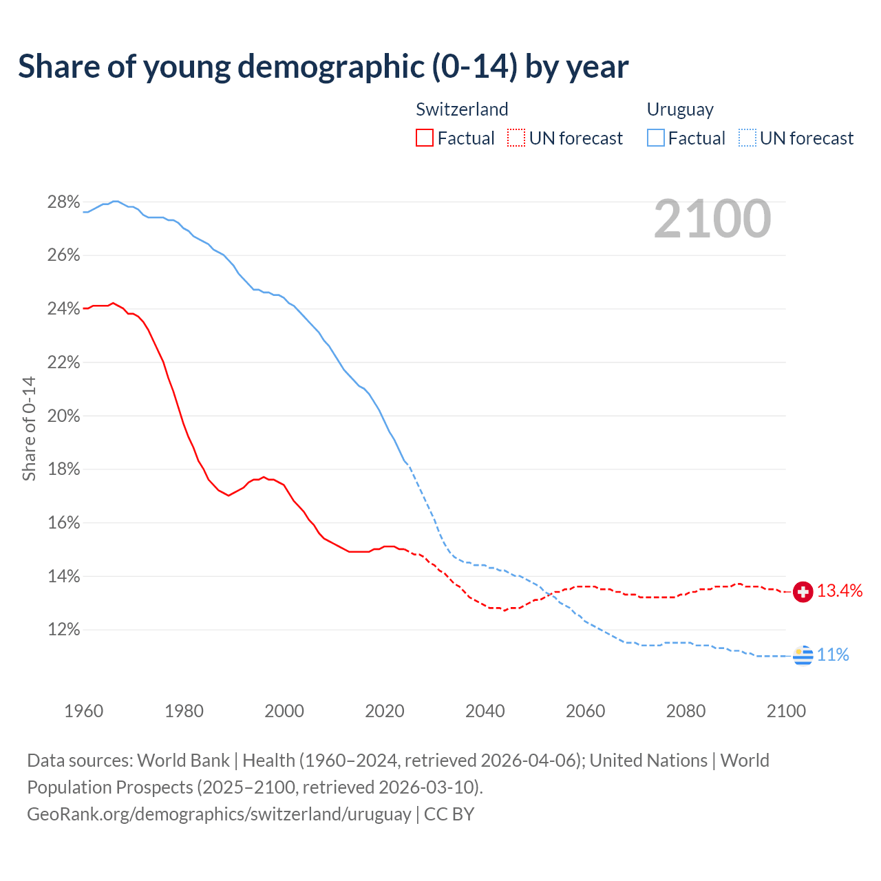 - The share of young demographic (0-15 years old) in Switzerland is 15% vs 18.3% in Uruguay.